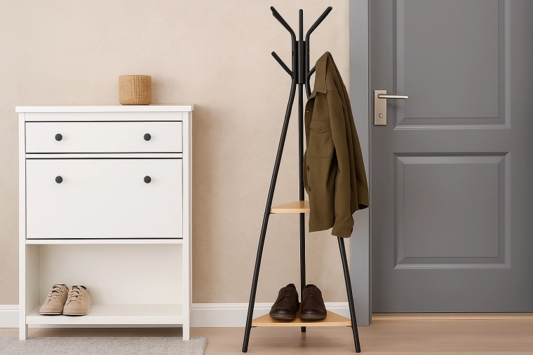 A masszív fekete fém és a hárompontos talp biztos tartást nyújt teljes terhelés mellett is, miközben nem foglal feleslegesen helyet az előszobában.
