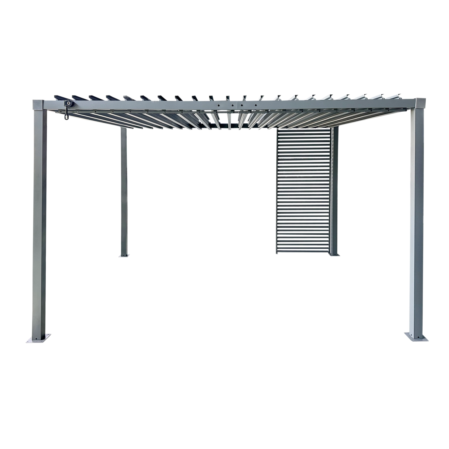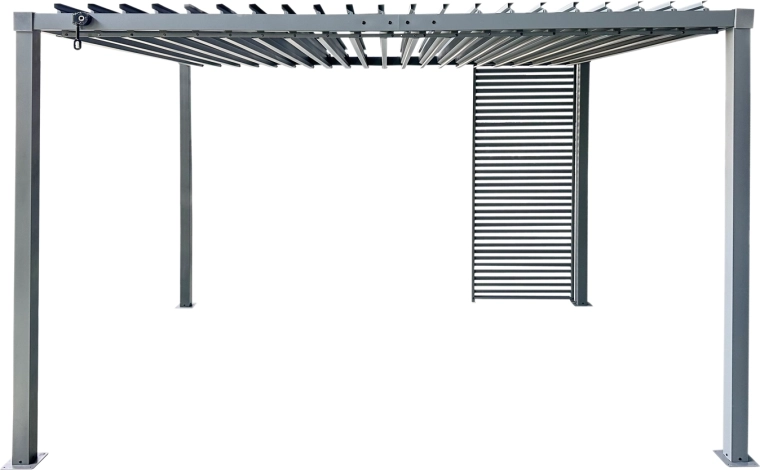 Dobja fel pergoláját elegáns fém zsaluzival, amely ötvözi a funkcionalitást, a tartósságot és a letisztult dizájnt. Az acél profilok a mindennapi használat mellett is stabilitást biztosítanak, míg a karcsú lamellák modern karaktert és kellemes árnyékot adnak a térnek.