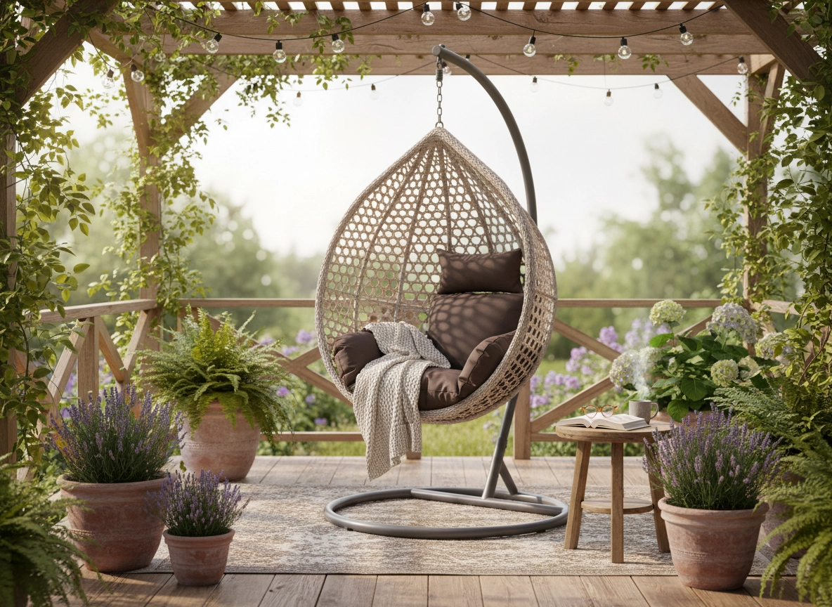 A kör alakú talppal és ívelt karral rendelkező állvány stabil tartást biztosít a finom ringatózáshoz. A puha párnázás az ülőfelületen és a háttámlán természetes testtartást támogat, növelve a kényelmet olvasás, laptopozás vagy pihenés közben.
