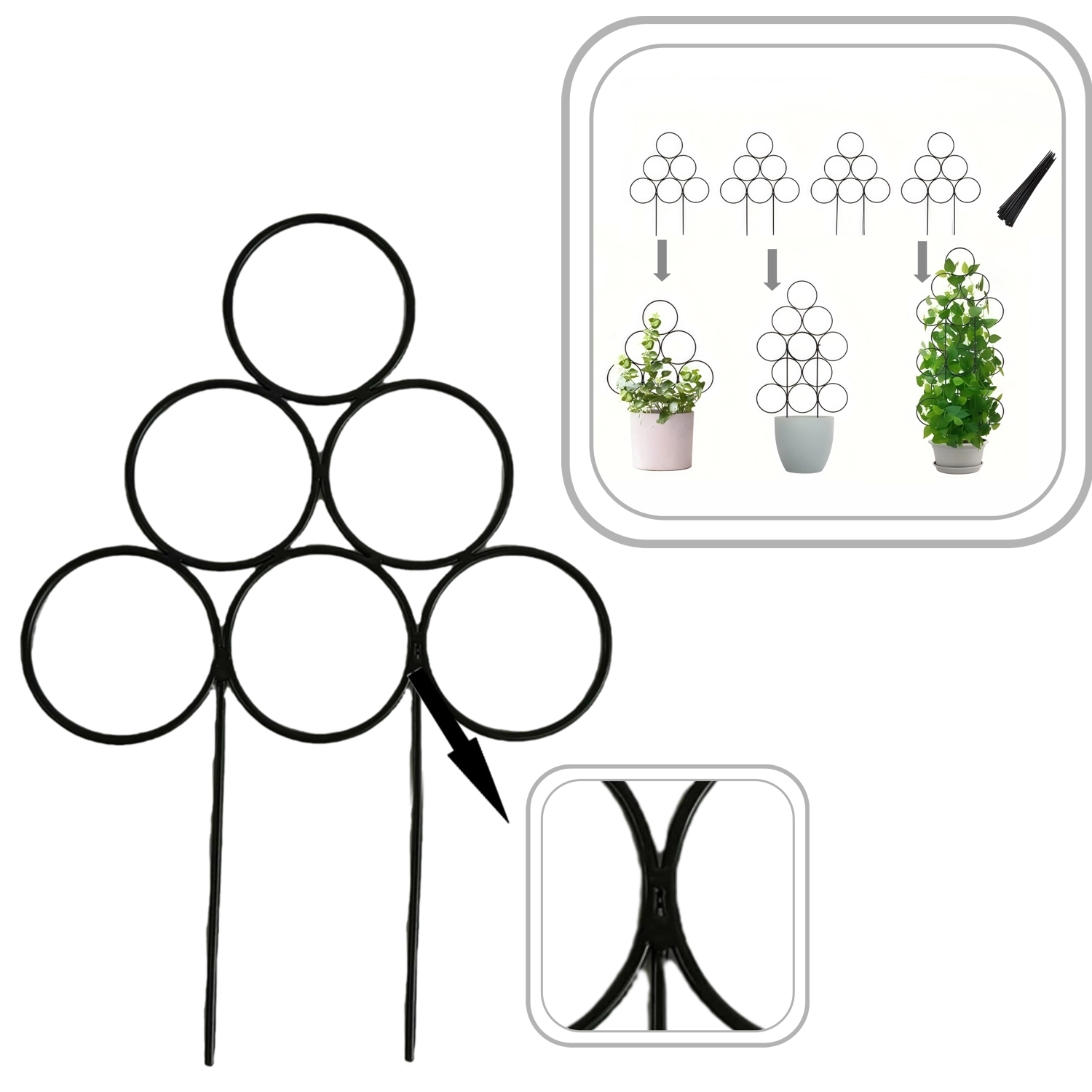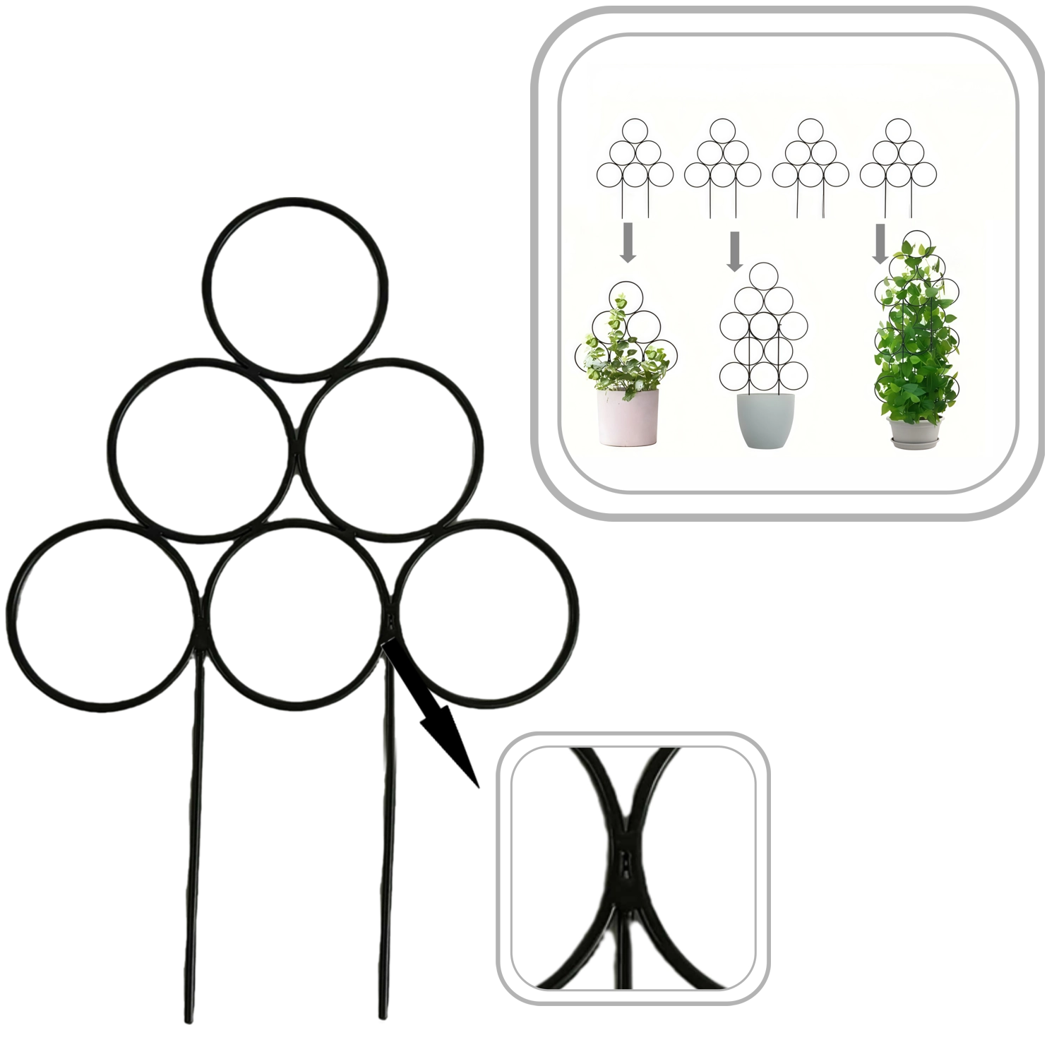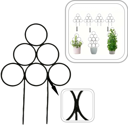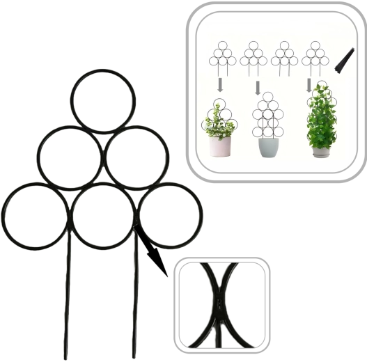 Az installálás gyors és szerszámmentes: egyszerűen helyezze a cserépbe, és rögzítse az indákat. A fém anyag hosszú élettartamot és szilárdságot garantál, így a növények intenzív növekedés idején is biztos támaszt kapnak.