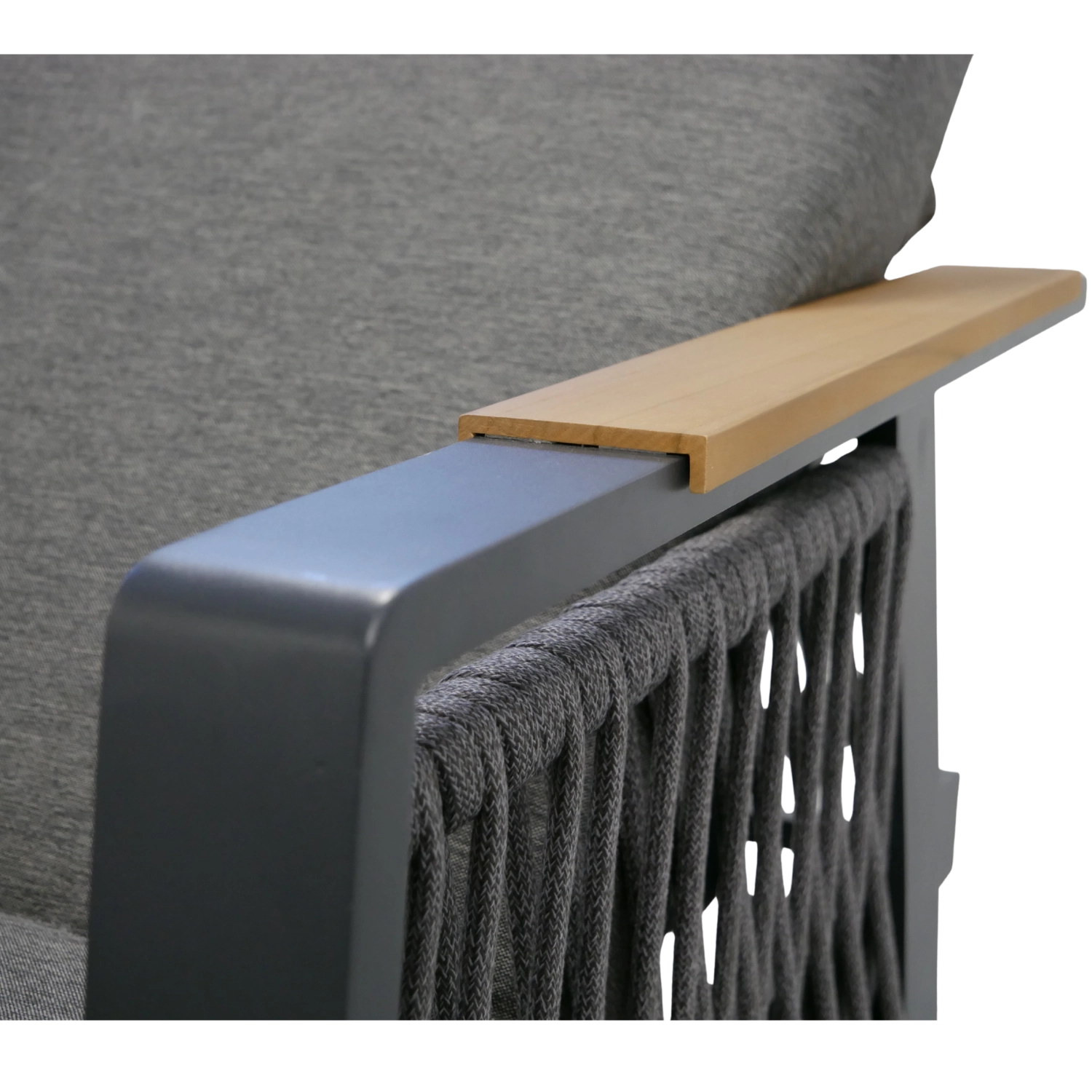 8 cm vastag párnák, fa hatású kartámaszok és oldalsó kötélfonat biztosítják a magas komfortot és a modern megjelenést.