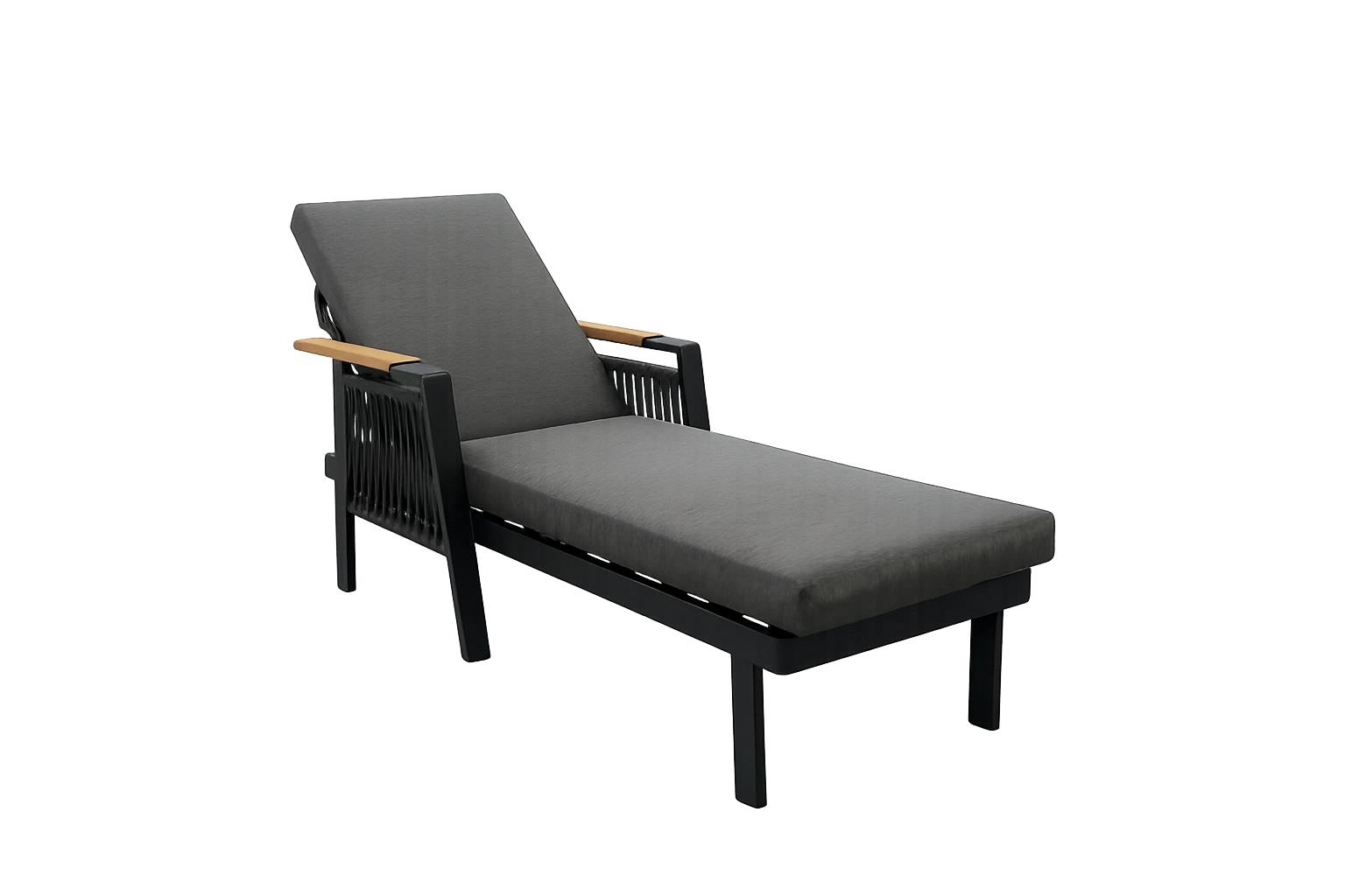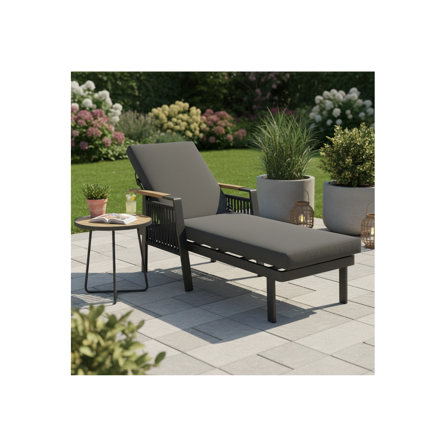 Élvezze a tökéletes pihenést a friss levegőn a Skopje kerti napozóággyal. A masszív alumínium váz, az állítható háttámla és a vastag, 8 cm-es párnák maximális kényelmet nyújtanak teraszon és kertben egyaránt. Az elegáns szürke dizájnt fa hatású kartámaszok és oldalsó kötélfonat egészítik ki, amelyek remekül illenek a modern kültérhez.