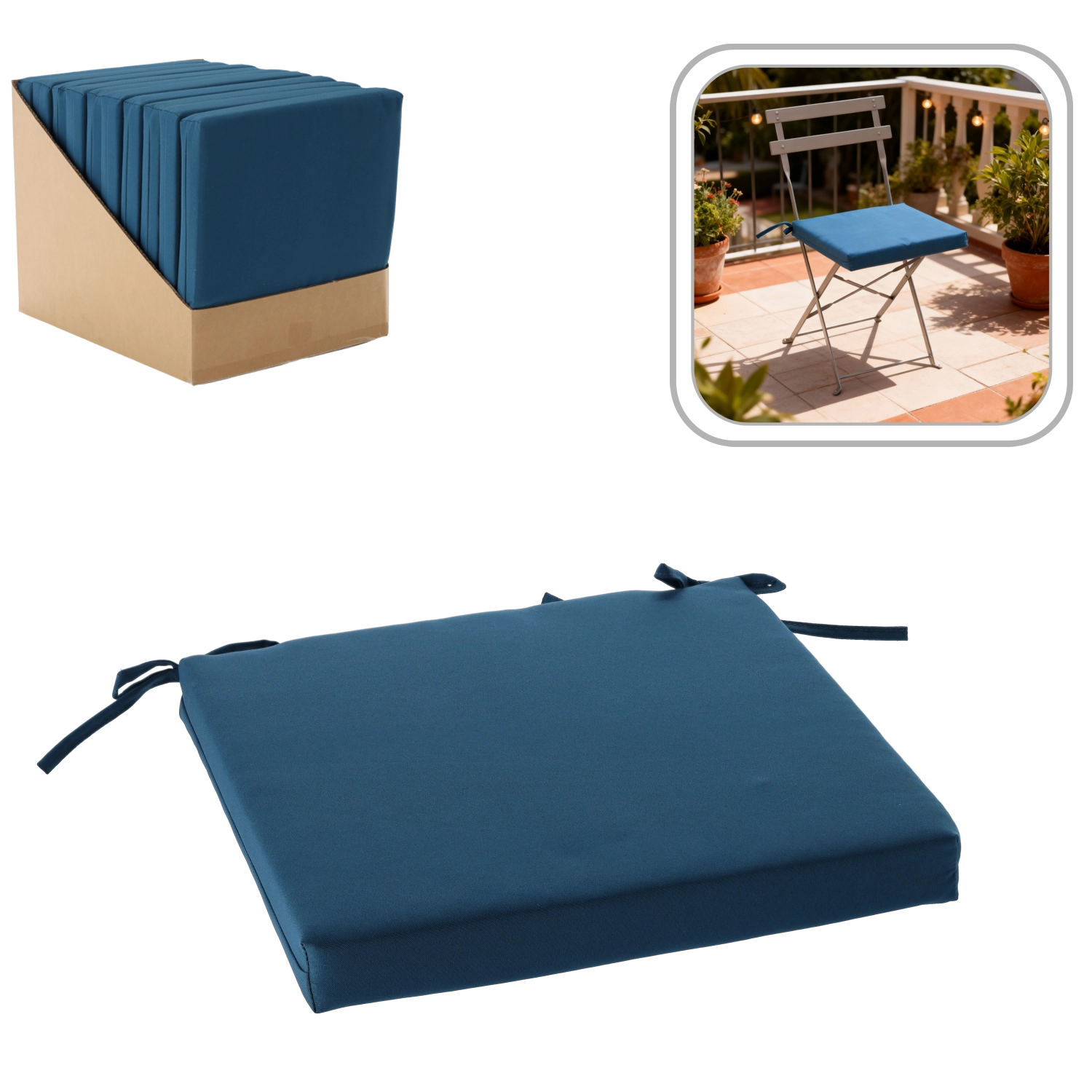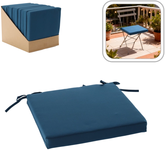 Az ülőpárna a univerzális 40 × 40 × 5 cm méretnek köszönhetően a legtöbb szabványos székre megfelelő. Az elegáns kék szín könnyen kombinálható a belső térrel és a kerti bútorokkal is, friss megjelenést kölcsönözve a környezetnek.