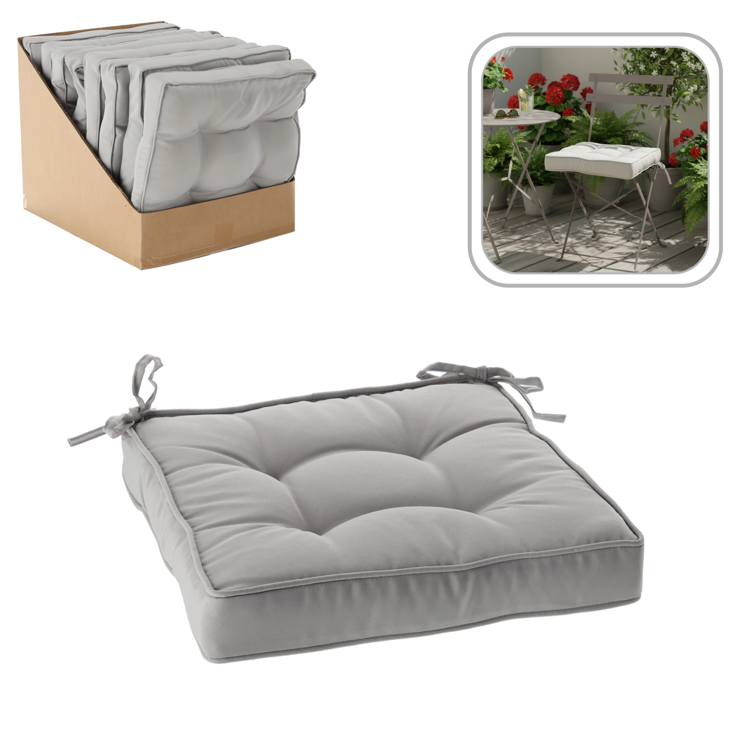 Stílusos, világosszürke székpárna 40 × 40 × 6 cm méretben, amely otthon és a kertben is kényelmes ülést biztosít. A puha poliészter töltetnek és a strapabíró huzatnak köszönhetően jól tartja a formáját, kellemes tapintású és könnyen tisztítható. A megkötő pántok stabil rögzítést adnak a széken, a dekoratív tűzések pedig elegáns megjelenést kölcsönöznek bármely enteriőrnek.