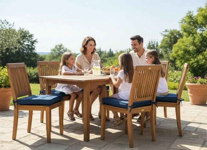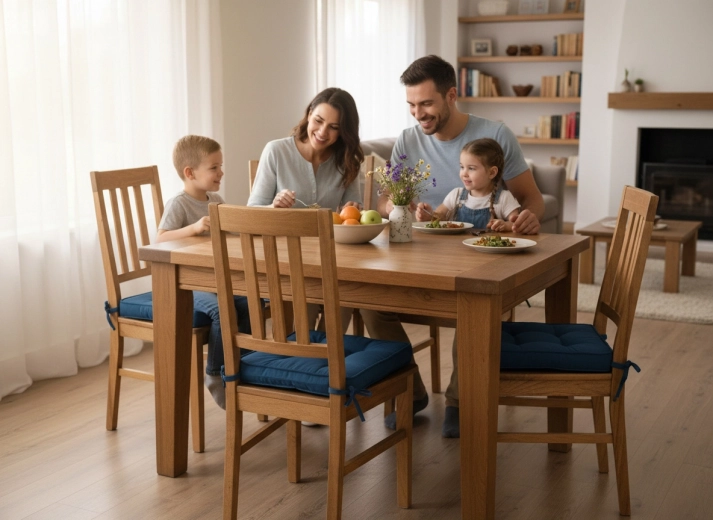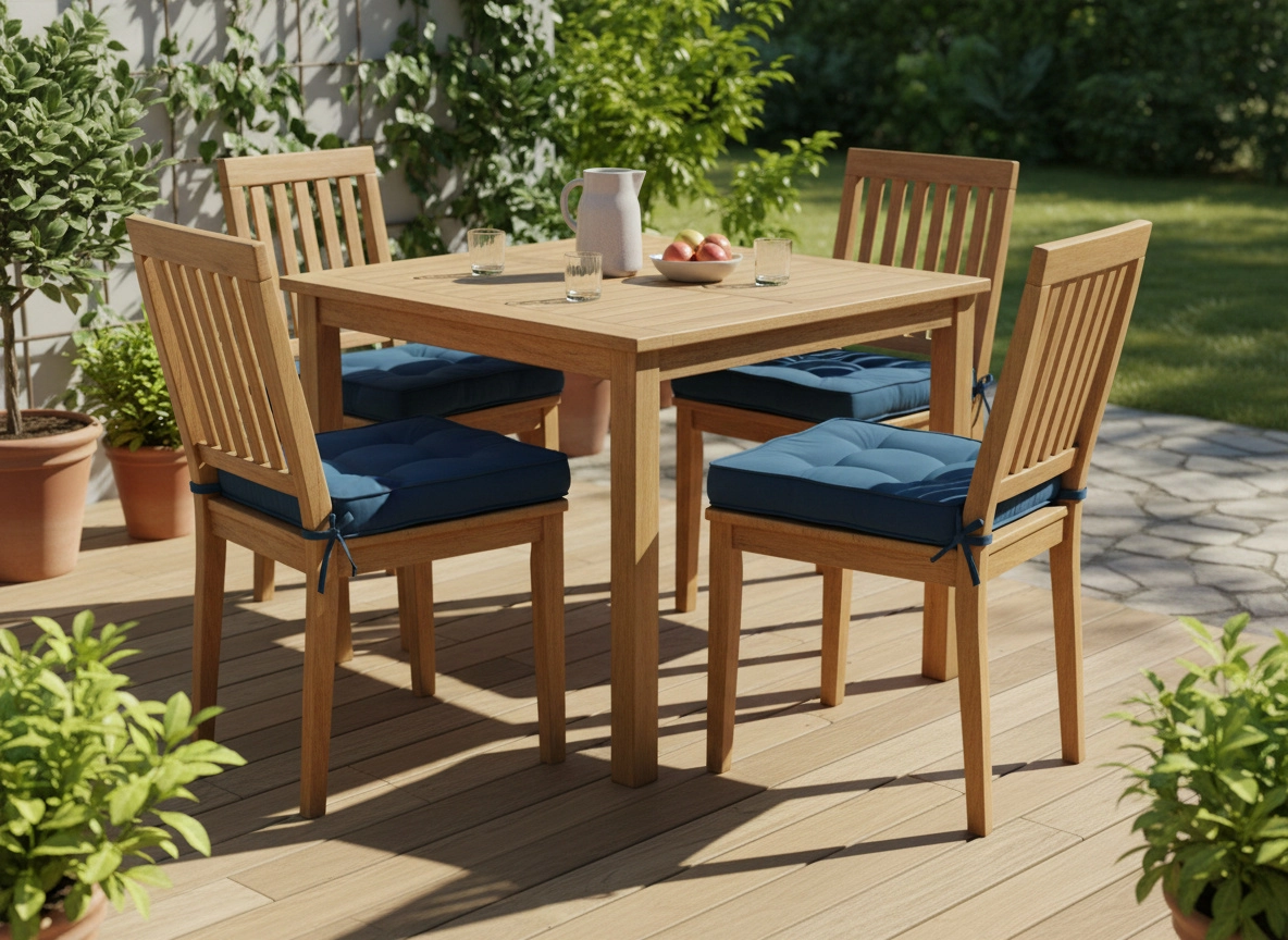 A tartós poliészter huzat és az időtálló kék szín remekül illik az étkezőbe, konyhába, valamint a kerti ülőhelyekre is.