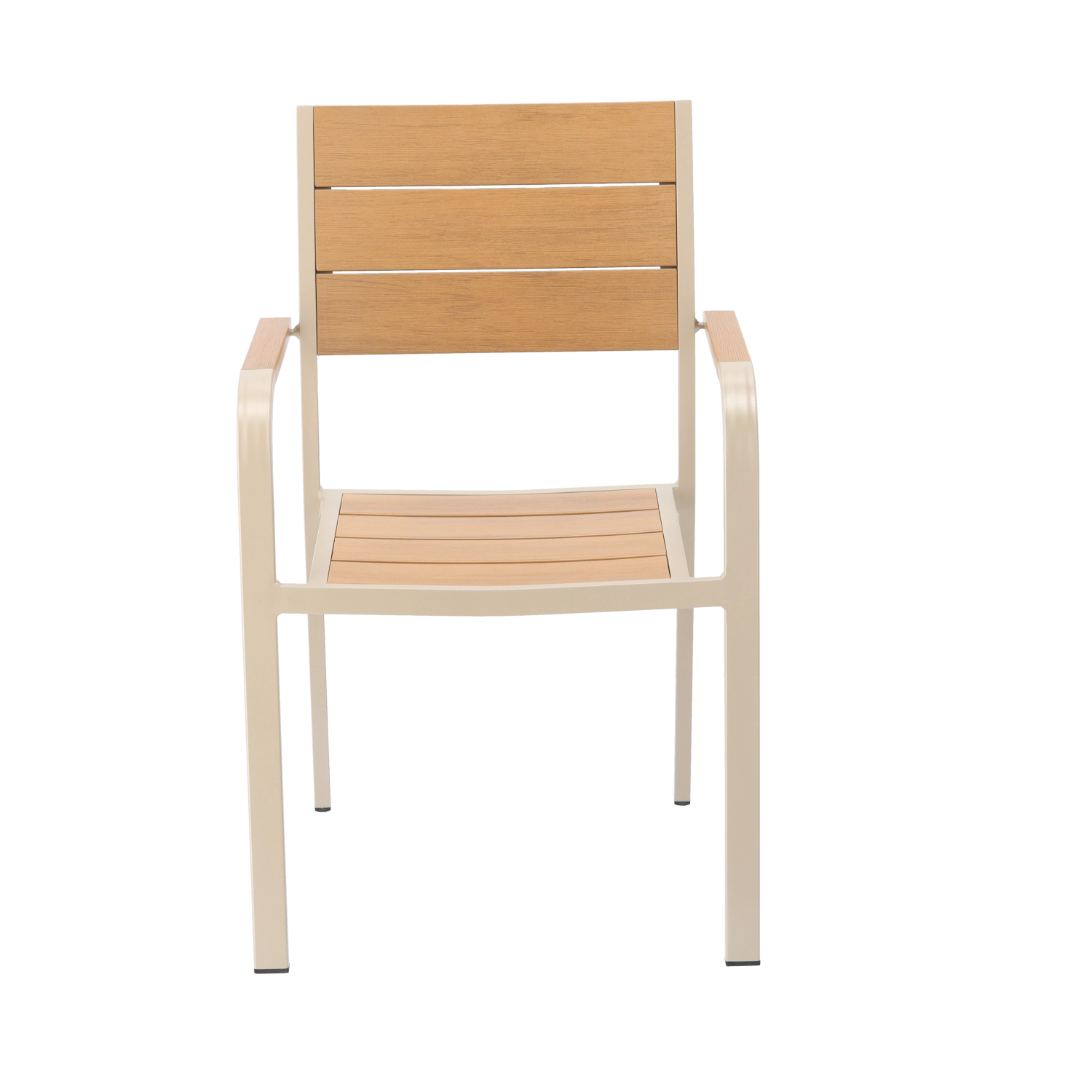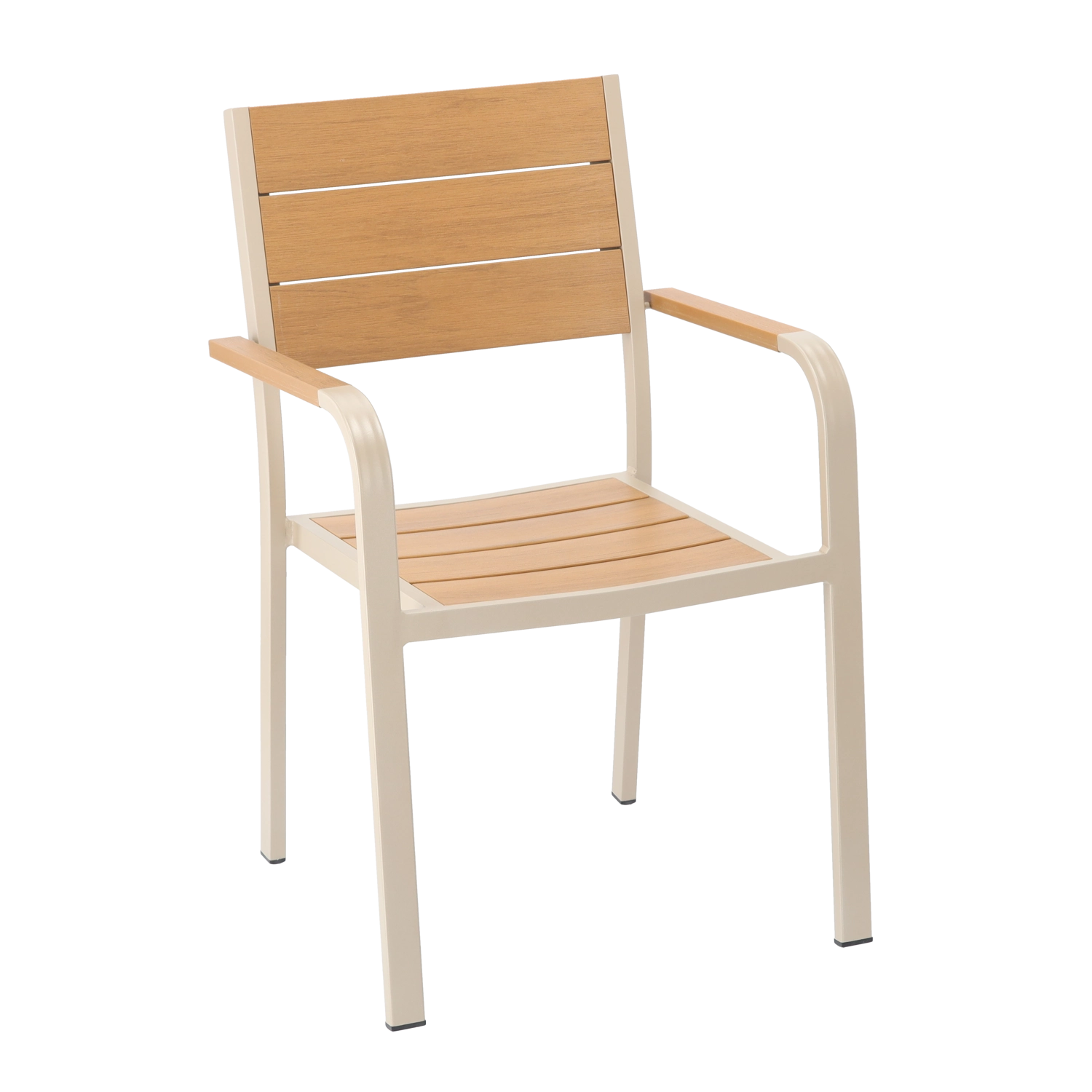 Az elegáns, bézs kerti szék a könnyű alumínium vázt fa hatású lécekkel ötvözi a természetes megjelenésért, komoly karbantartási igény nélkül. A porszórt bevonatnak köszönhetően ellenáll a nedvességnek, a napnak és a mindennapos használatnak, így remekül illik modern és klasszikus külterekbe egyaránt.