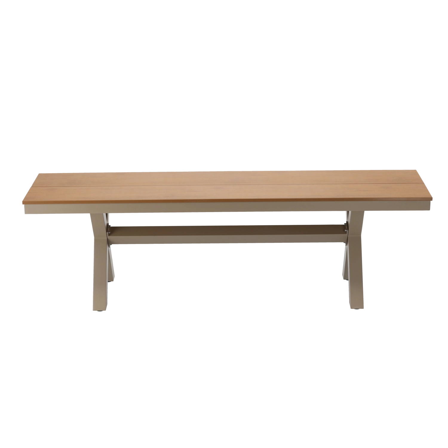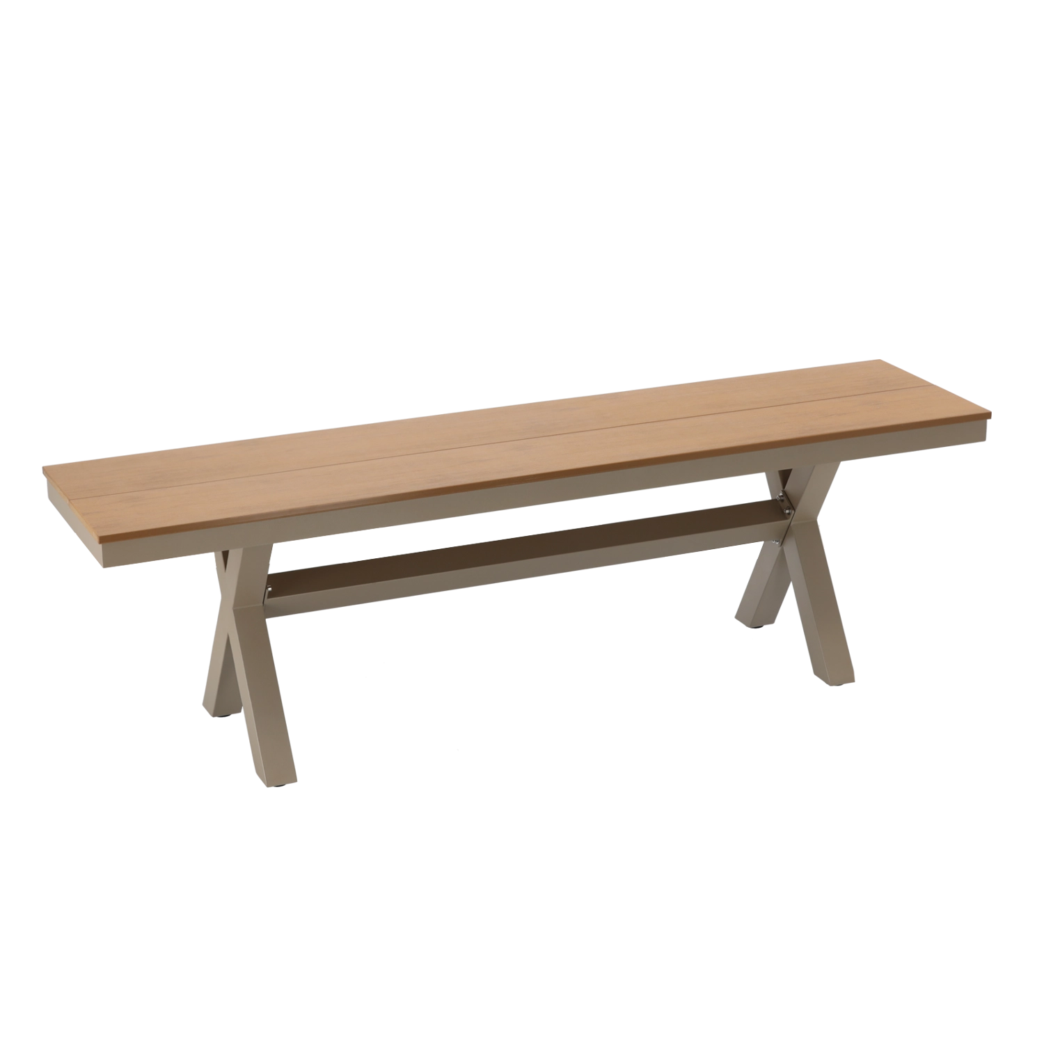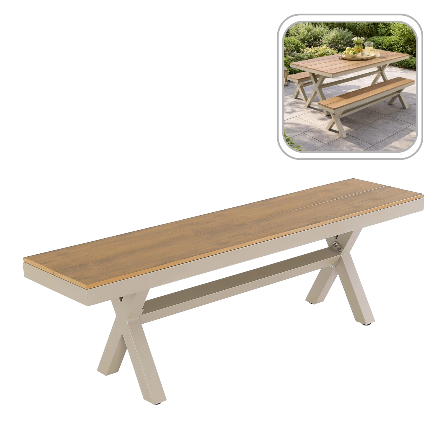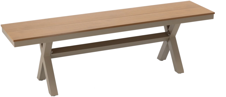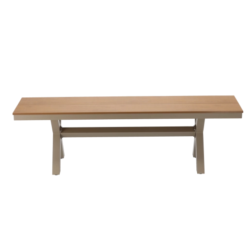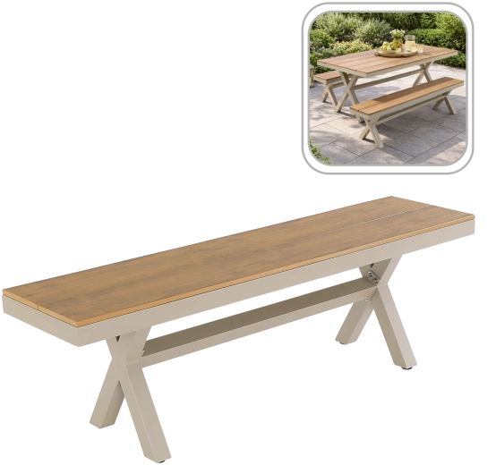 Elegáns, bézs színű alumínium kerti pad, amely ötvözi a modern, minimalista dizájnt, a kis tömeget és stabilitást, valamint a magas időjárásállóságot. A fahatású ülőfelületnek köszönhetően nem igényel körülményes karbantartást, és remekül illik teraszra, kertbe vagy a ház bejáratához.