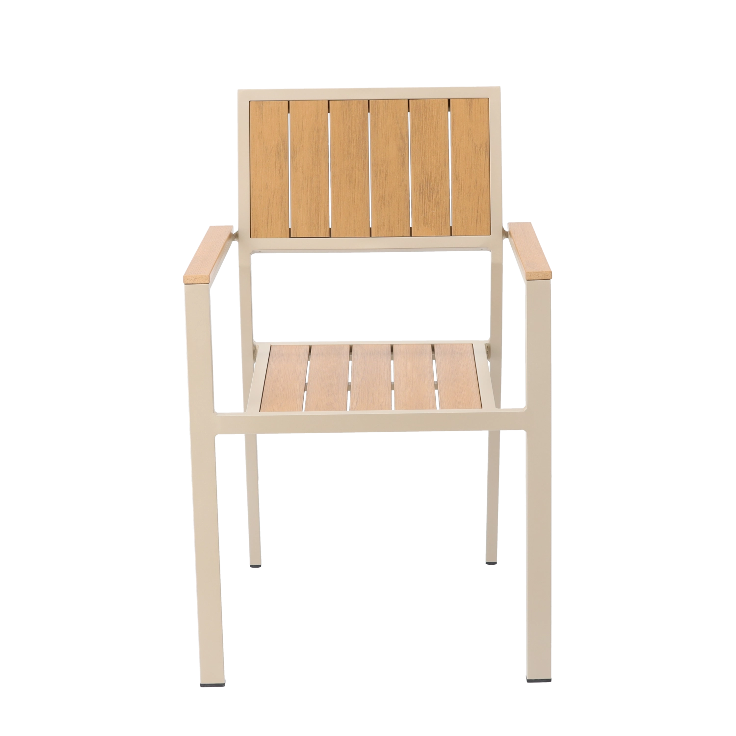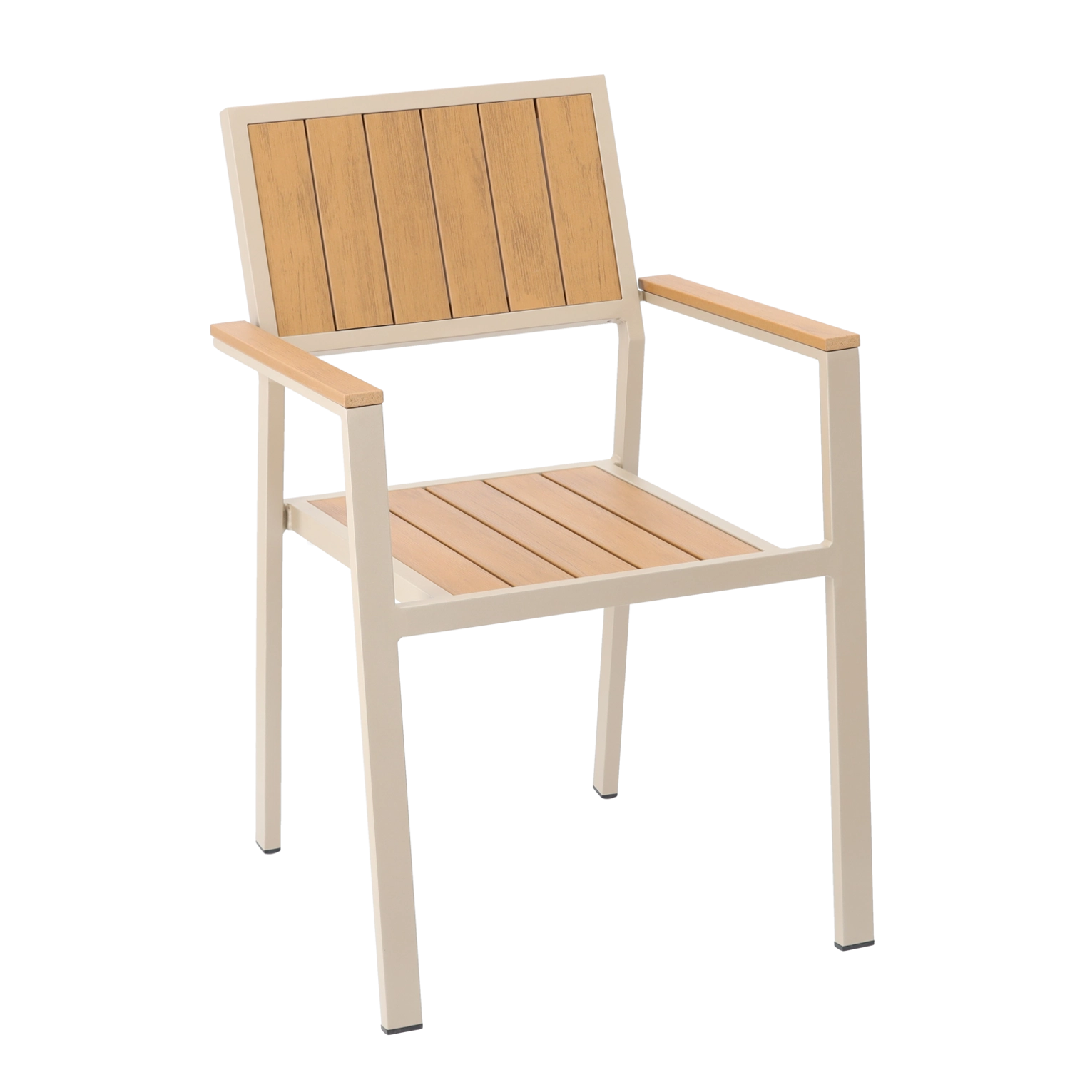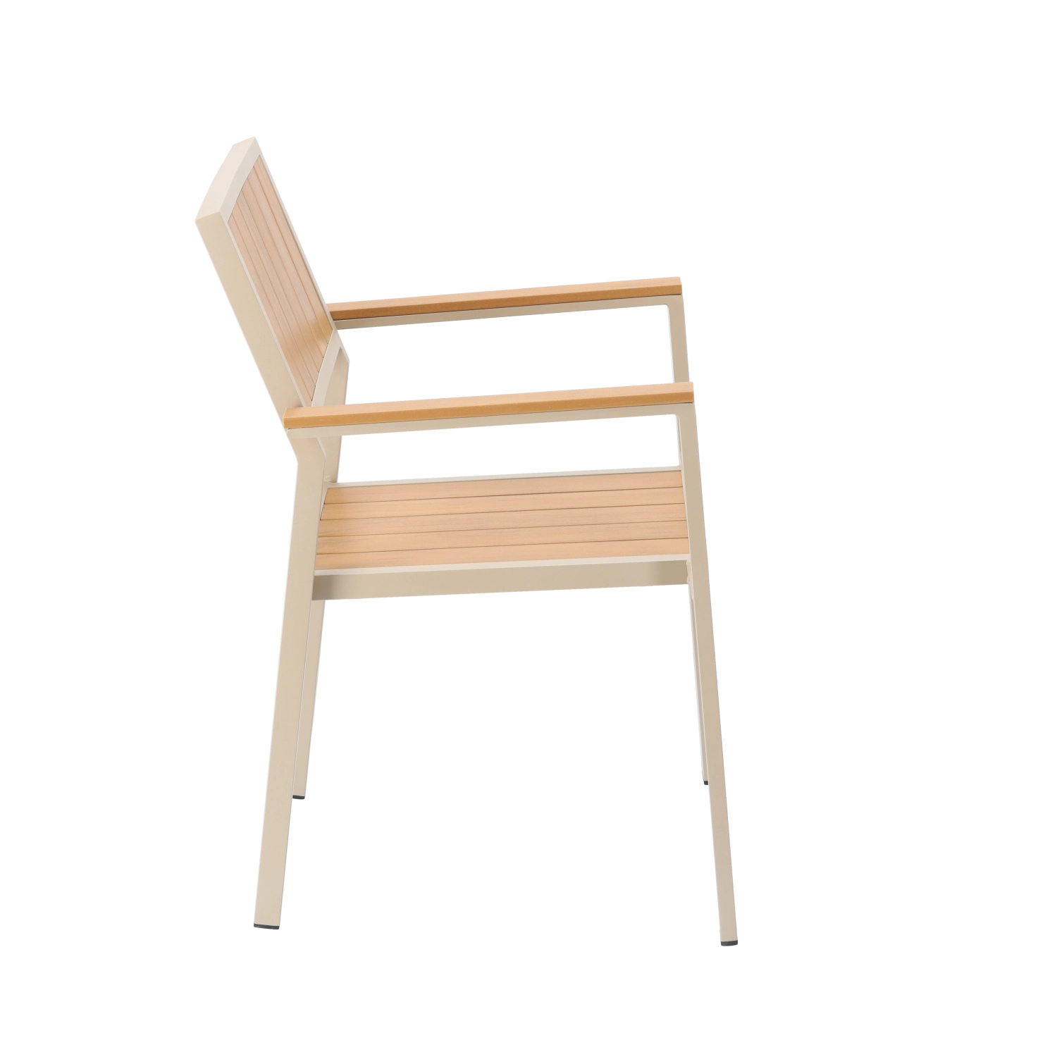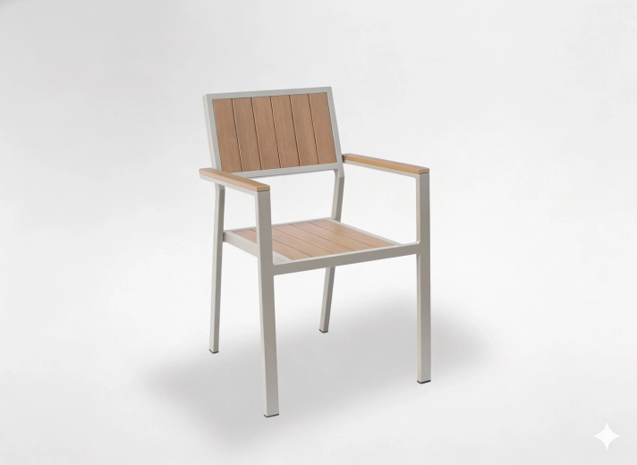 Ez a stílusos, bézs színű alumínium kerti szék ideális választás kültéri pihenéshez. A porszórt bevonatú váz ellenáll a nedvességnek és a napsütésnek, míg a fa hatású lamellák természetes megjelenést adnak rendszeres karbantartás nélkül. Az átgondolt, kartámaszos kialakításnak köszönhetően a szék mindennapos használat során is kényelmes.