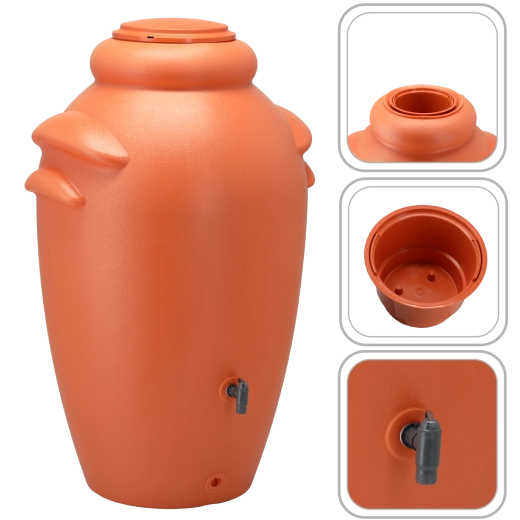 Elegáns, 350 literes, téglavörös kerti esővízgyűjtő, amely a praktikus víztárolást dekoratív dizájnnal ötvözi. A beépített virágtartónak (20 cm mély) köszönhetően könnyedén zöld akcentust teremthet közvetlenül a tartályon. Két menet a csap és a tömlő számára biztosítja a kényelmes vízvételt és a könnyű leeresztést tél előtt. Az UV-álló, tartós anyagok hosszú élettartamot és kültéri stabilitást garantálnak.