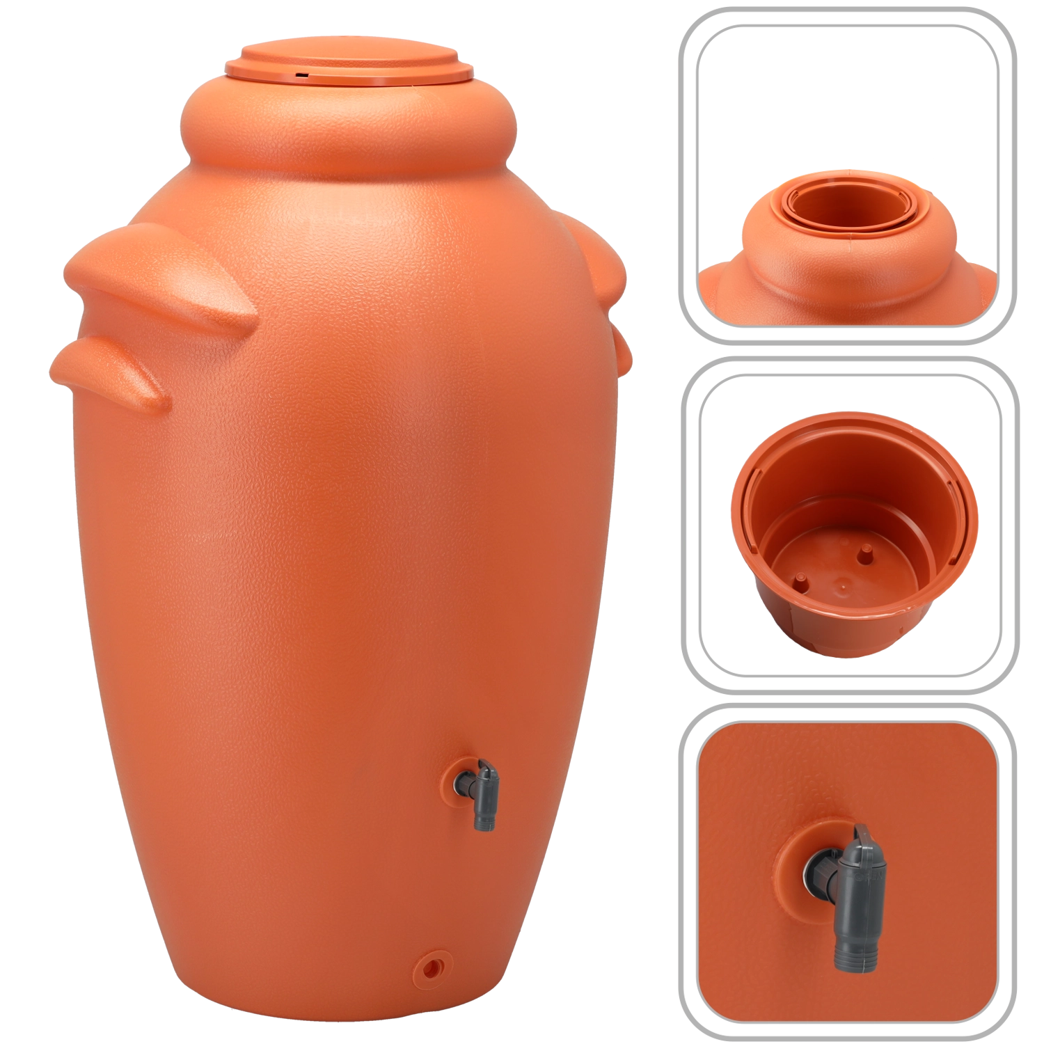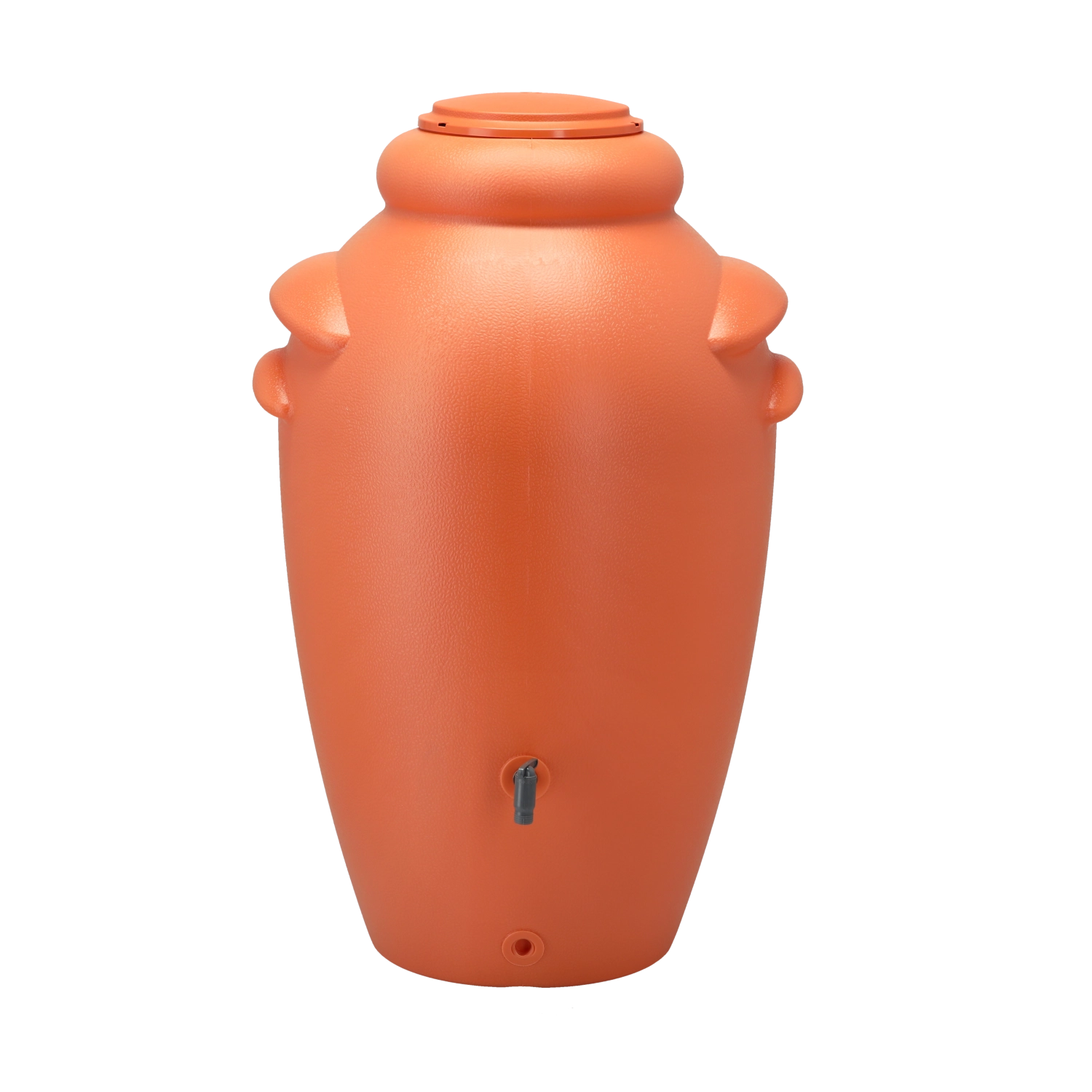 A texturált felület és az elegáns vázaforma a tartályt a kert funkcionális és esztétikus díszévé emeli.