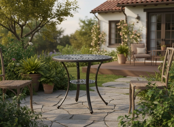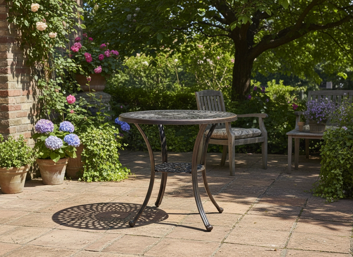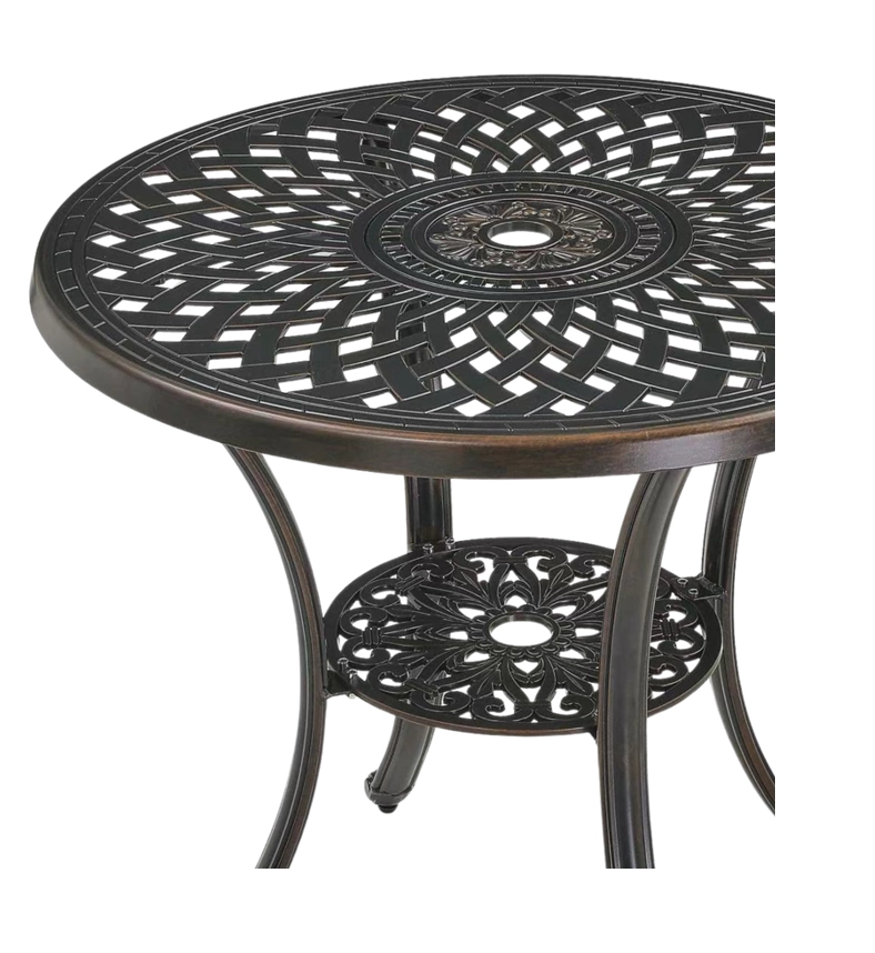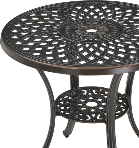 A dekoratív, kör alakú asztallap és a bronz kivitel egyedi karaktert és időtlen eleganciát ad a terasznak vagy a kertnek.