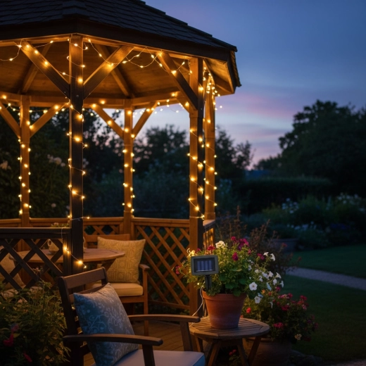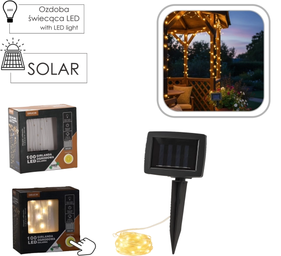 A füzér folyamatos fény vagy villogás üzemmódot kínál, és IP44 páravédettséggel rendelkezik, így ellenáll a szokásos kültéri körülményeknek. Teljes, 7–8 órás napsütéses töltés után körülbelül 6–7 órán át világít, ideális a nyári estékhez.
