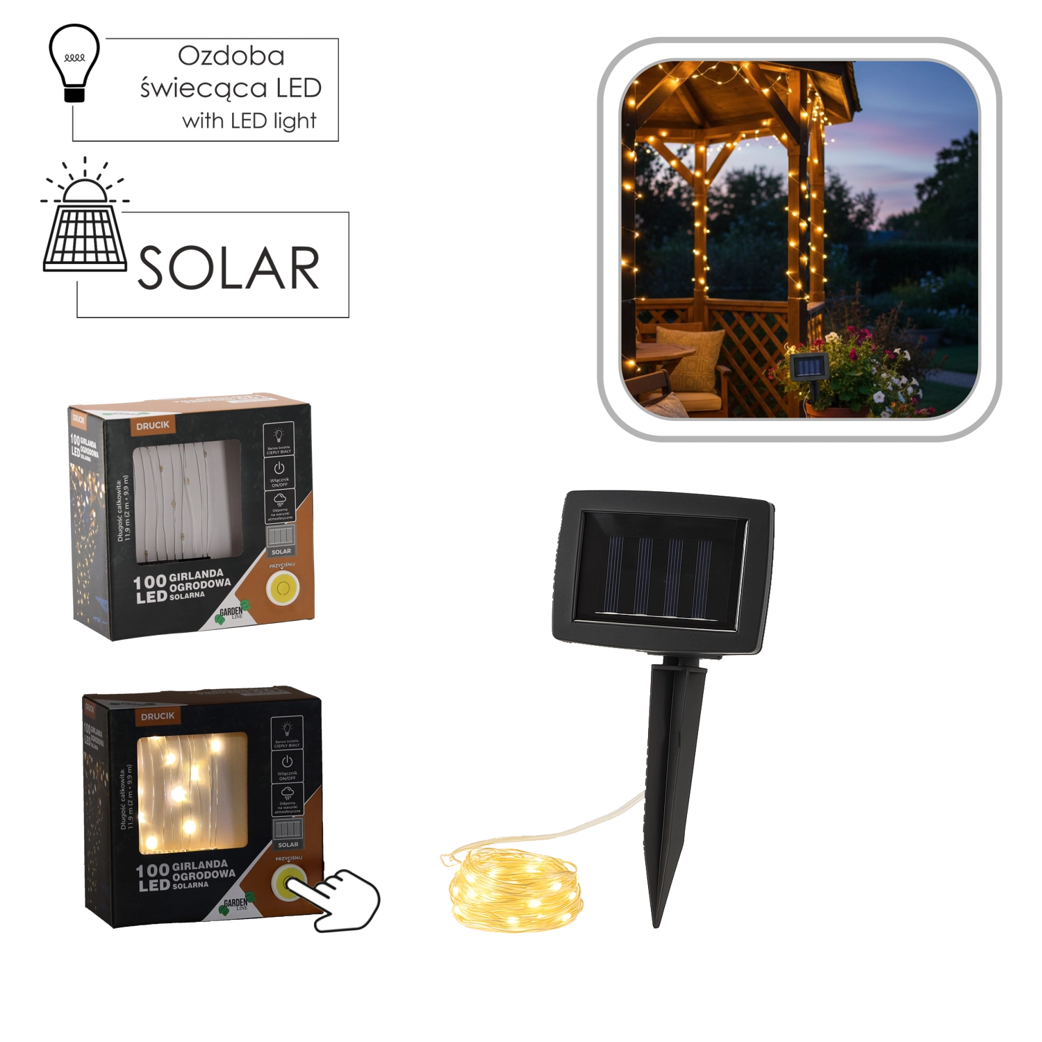 A napelemes LED fényfüzér kellemes, melegfehér hangulatot varázsol a kültéri terekbe. A 9,9 m hosszú fénylánc 10 cm-es LED-távolsággal egyenletes és dekoratív megvilágítást ad kerítéseknek, pergoláknak, fáknak és korlátoknak. A polikristályos napelem és a Ni‑MH 1,2 V AA 400 mAh újratölthető akkumulátor biztosítja a vezeték nélküli, karbantartásmentes működést.