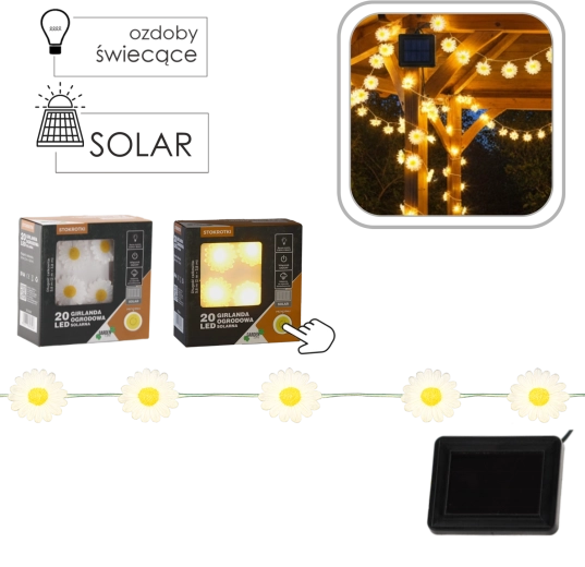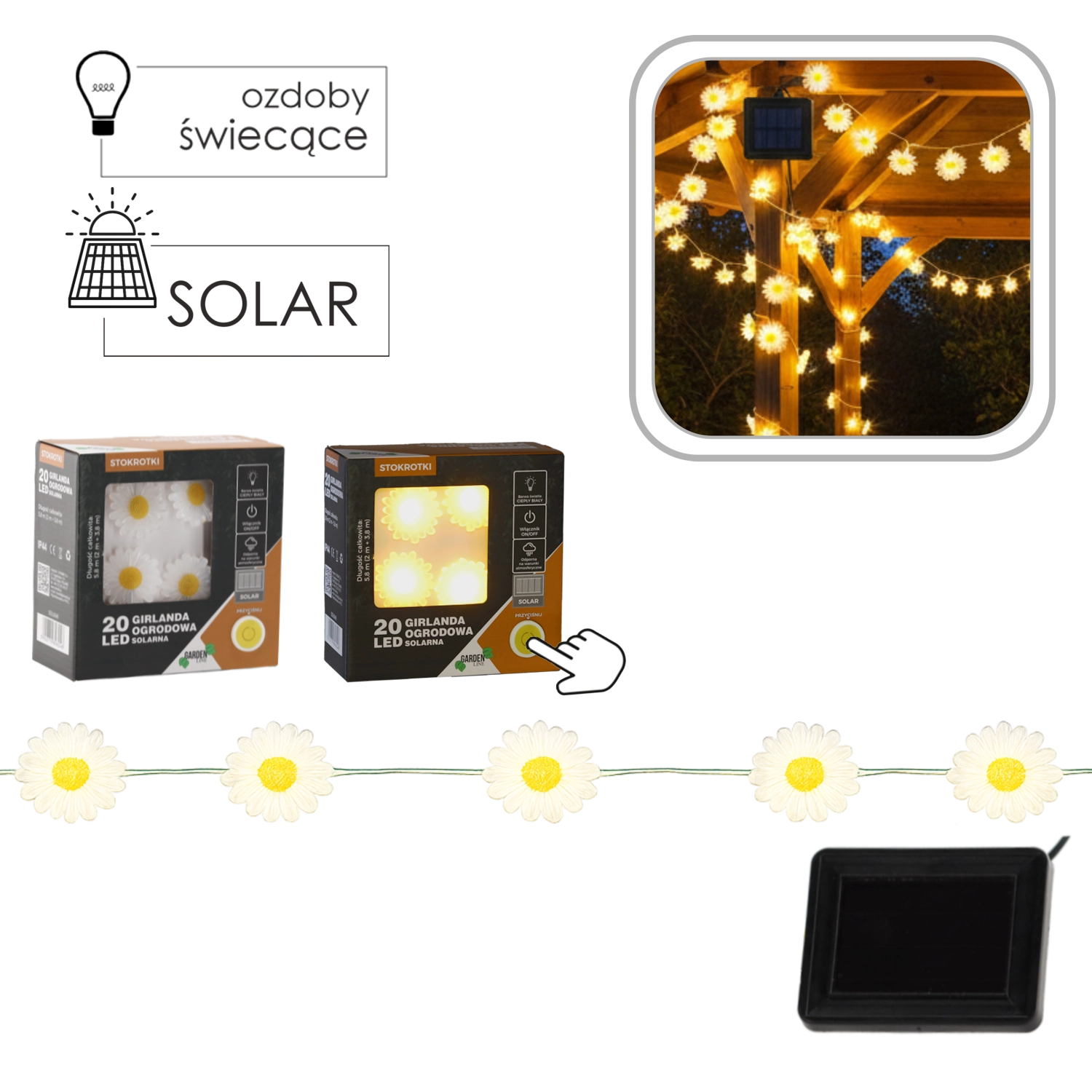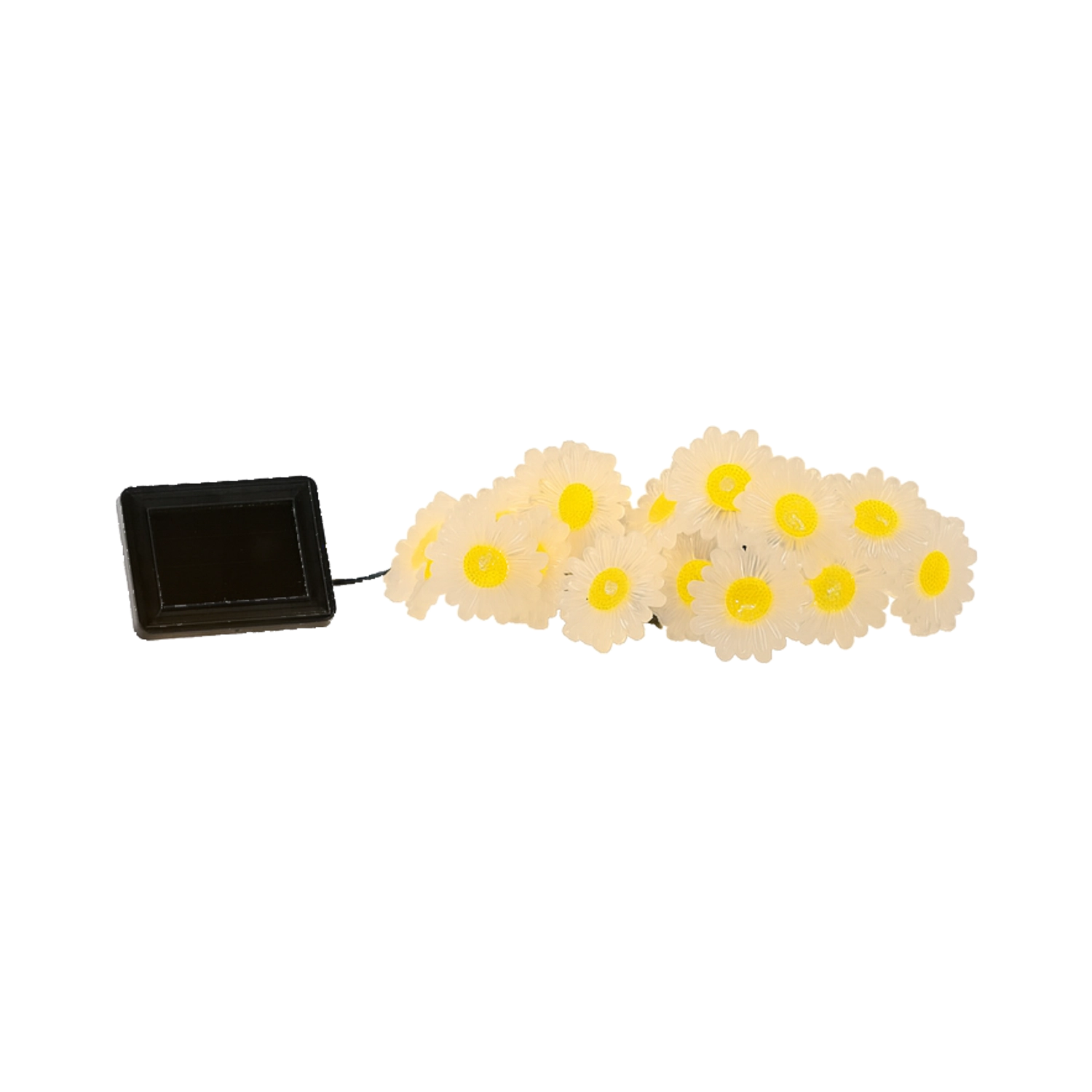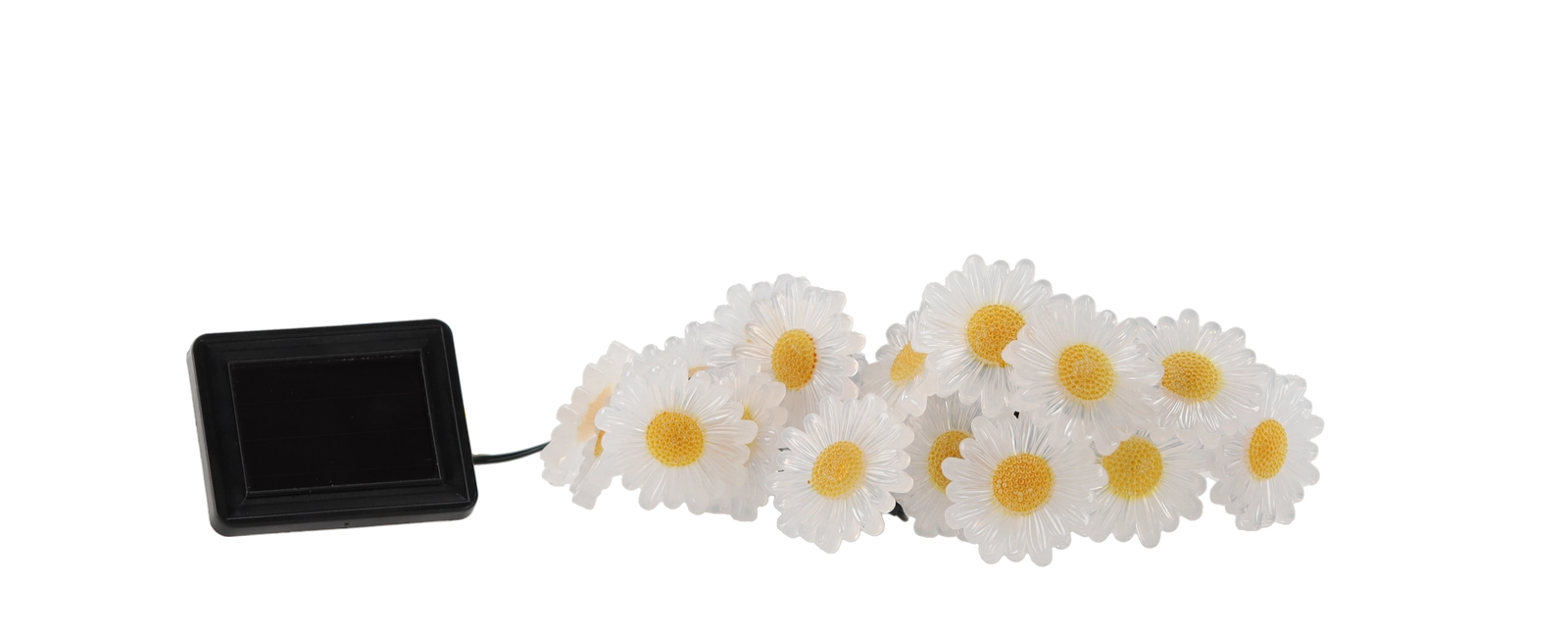 Dobja fel teraszát, erkélyét és kertjét a százszorszépekkel díszített napelemes fényfüzérrel. Kínál 20 LED-et meleg fehér árnyalatban, két kábelhosszt 2 + 3,8 m, választható folyamatos világítás vagy villogás üzemmódot, valamint IP44 védettséget kültéri használathoz. A működést félkristályos napelem és újratölthető akkumulátor biztosítja, akár 6–7 óra fényt nyújtva.