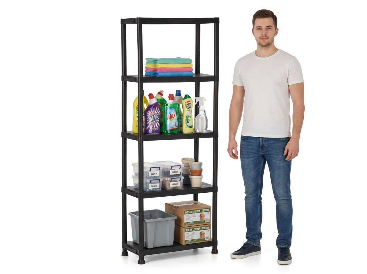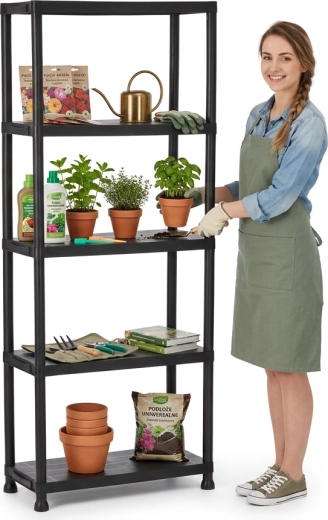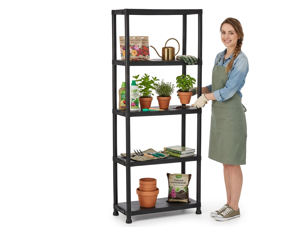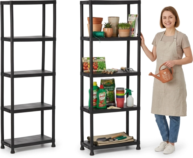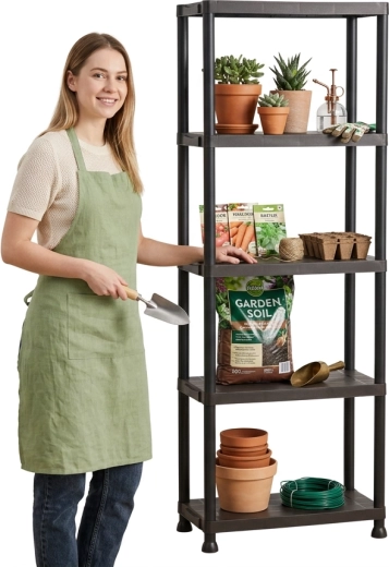 Maximalizálja a helyet az 5 szintes műanyag polccal, 61 × 31 × 171 cm méretben. A keskeny alapterület helyet takarít meg, míg a masszív, polconként 25 kg teherbírású felületek megbízhatóan tartják a szerszámokat, tisztítószereket, dobozokat, cserepeket és háztartási készleteket. A nyitott keret megkönnyíti a kezelést és javítja a légáramlást, így a tárolt tárgyak áttekinthetők és gyorsan kézre állnak.