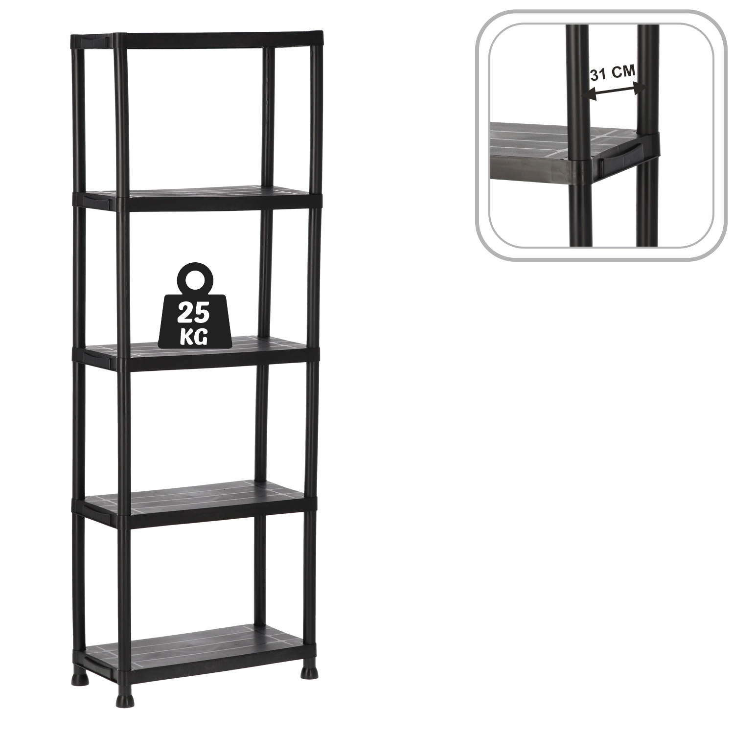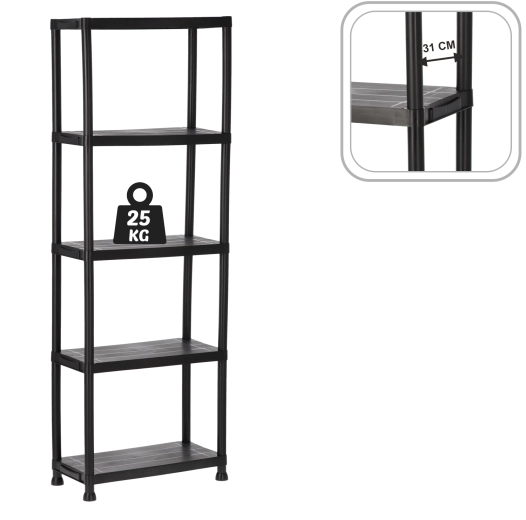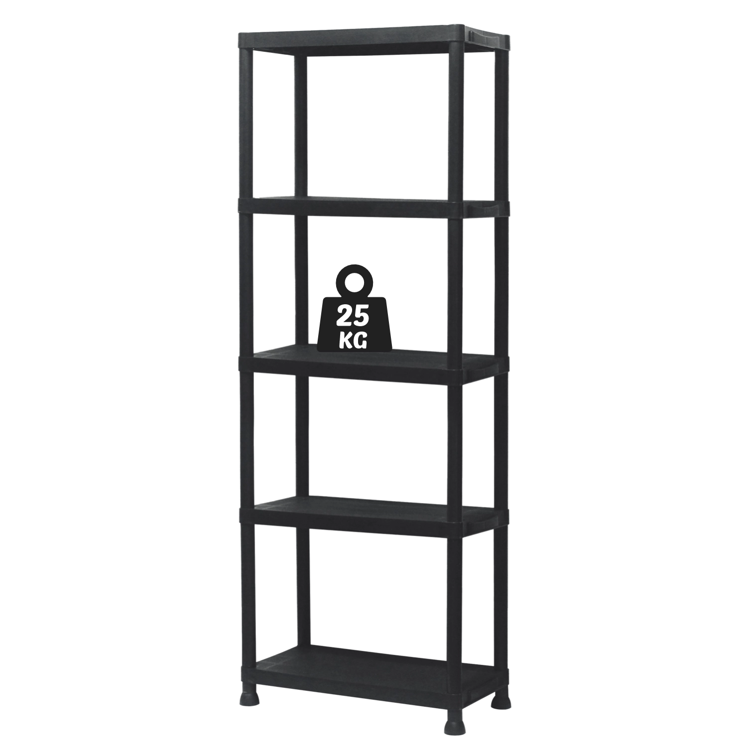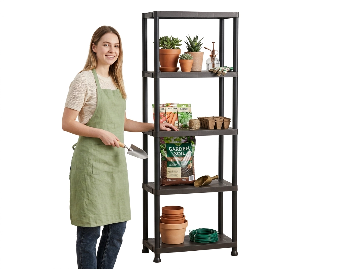 Maximalizálja a helyet az 5 szintes műanyag polccal, 61 × 31 × 171 cm méretben. A keskeny alapterület helyet takarít meg, míg a masszív, polconként 25 kg teherbírású felületek megbízhatóan tartják a szerszámokat, tisztítószereket, dobozokat, cserepeket és háztartási készleteket. A nyitott keret megkönnyíti a kezelést és javítja a légáramlást, így a tárolt tárgyak áttekinthetők és gyorsan kézre állnak.