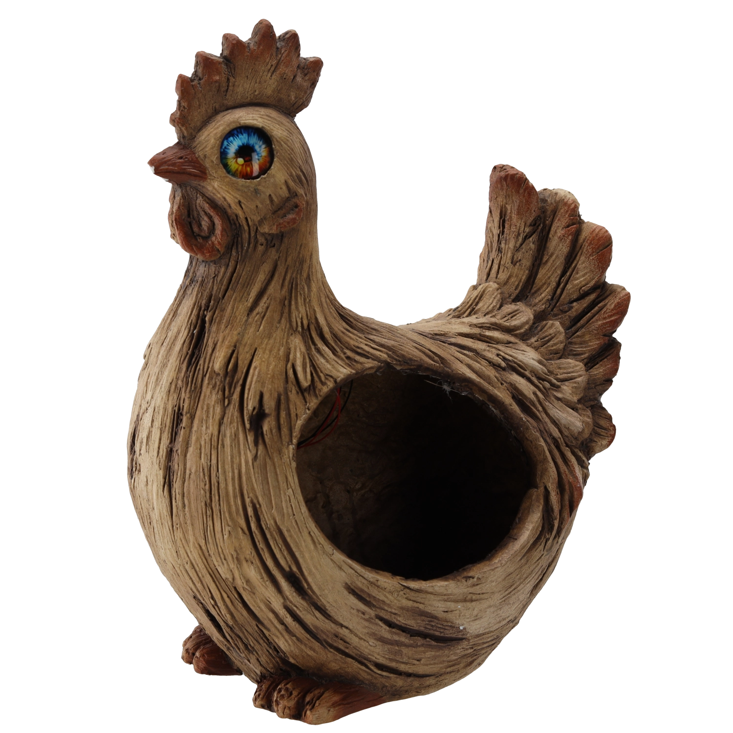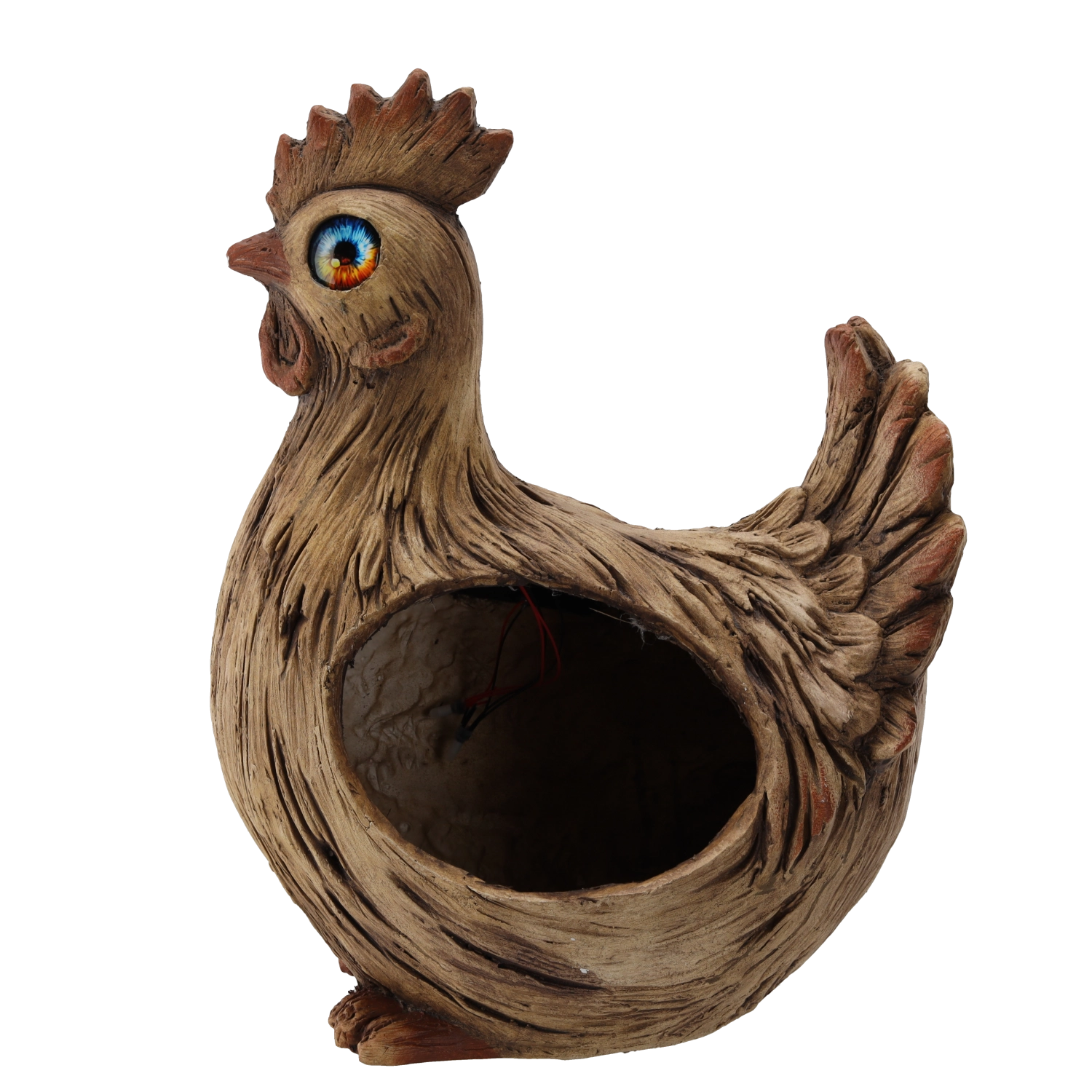 Stílusos kakasfigura üreges testtel apró növények, fűszerek vagy dekorációk elhelyezéséhez – feltűnő dísze lesz kertjének. A két melegfehér LED a szemekben sötétedés után kellemes hangulatot teremt, és növeli a környezet esztétikai értékét.