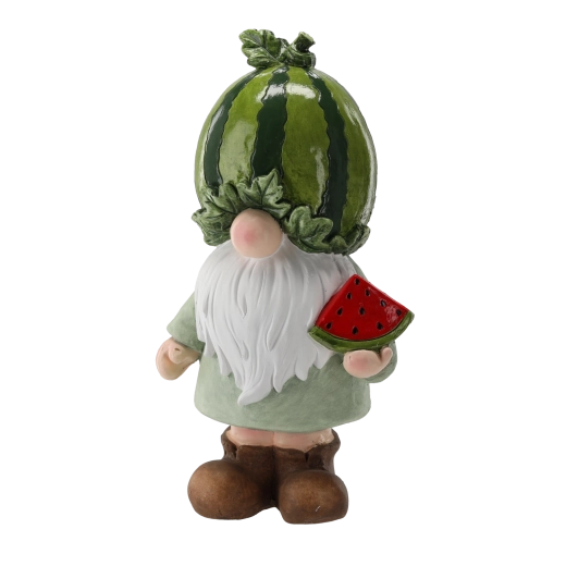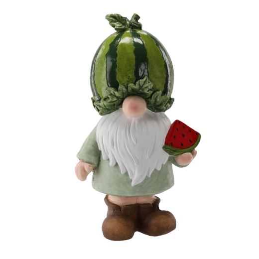 Ez a bájos manó görögdinnyés sapkával és dinnyeszelettel a kezében azonnal megragadja a figyelmet. A minőségi MGO anyagnak (magnézium-oxid üvegszállal) köszönhetően a figura masszív, stabil, és egész évben alkalmas kültéri használatra. A fényes, részletgazdagon festett felület nyárias hangulatot áraszt, és egyedi karaktert kölcsönöz kültéri terének.