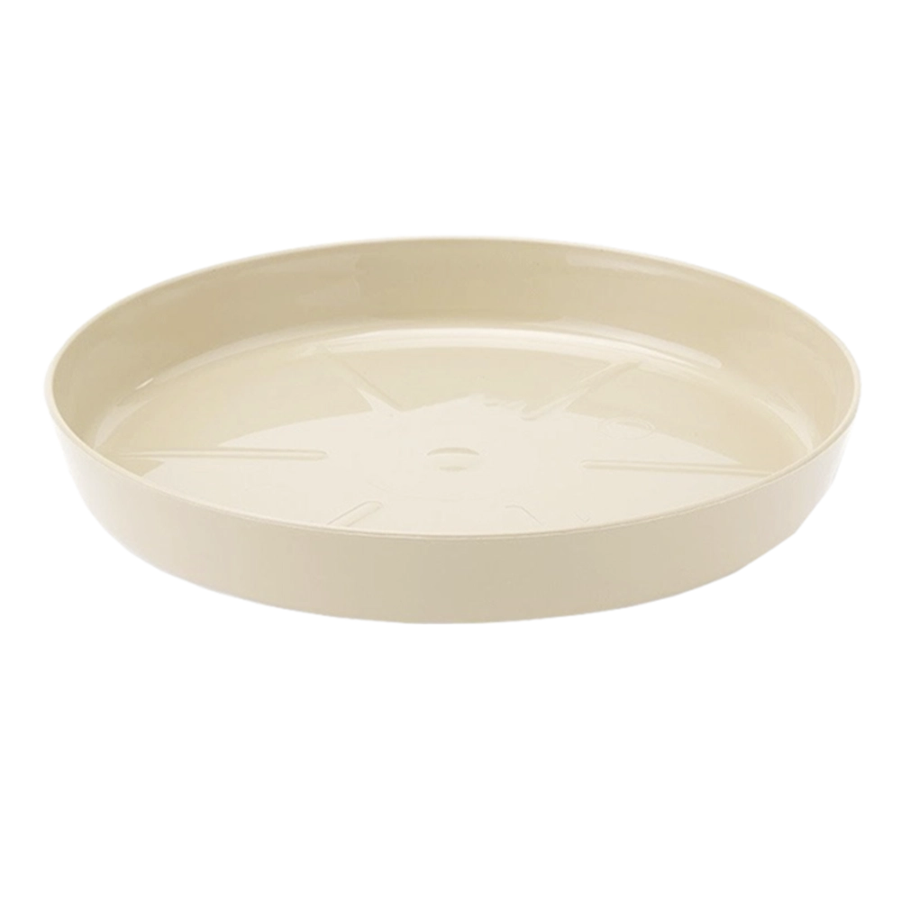 Elegáns Lamela alátét krémszínben, 28 cm átmérővel és 4,1 cm magassággal, ideális 30 cm átmérőjű cserepekhez, különösen a Magnolia modellekhez. Fényes felületet, UV-állóságot és időjárásállóságot kínál, és beltéri és kültéri használatra egyaránt alkalmas.