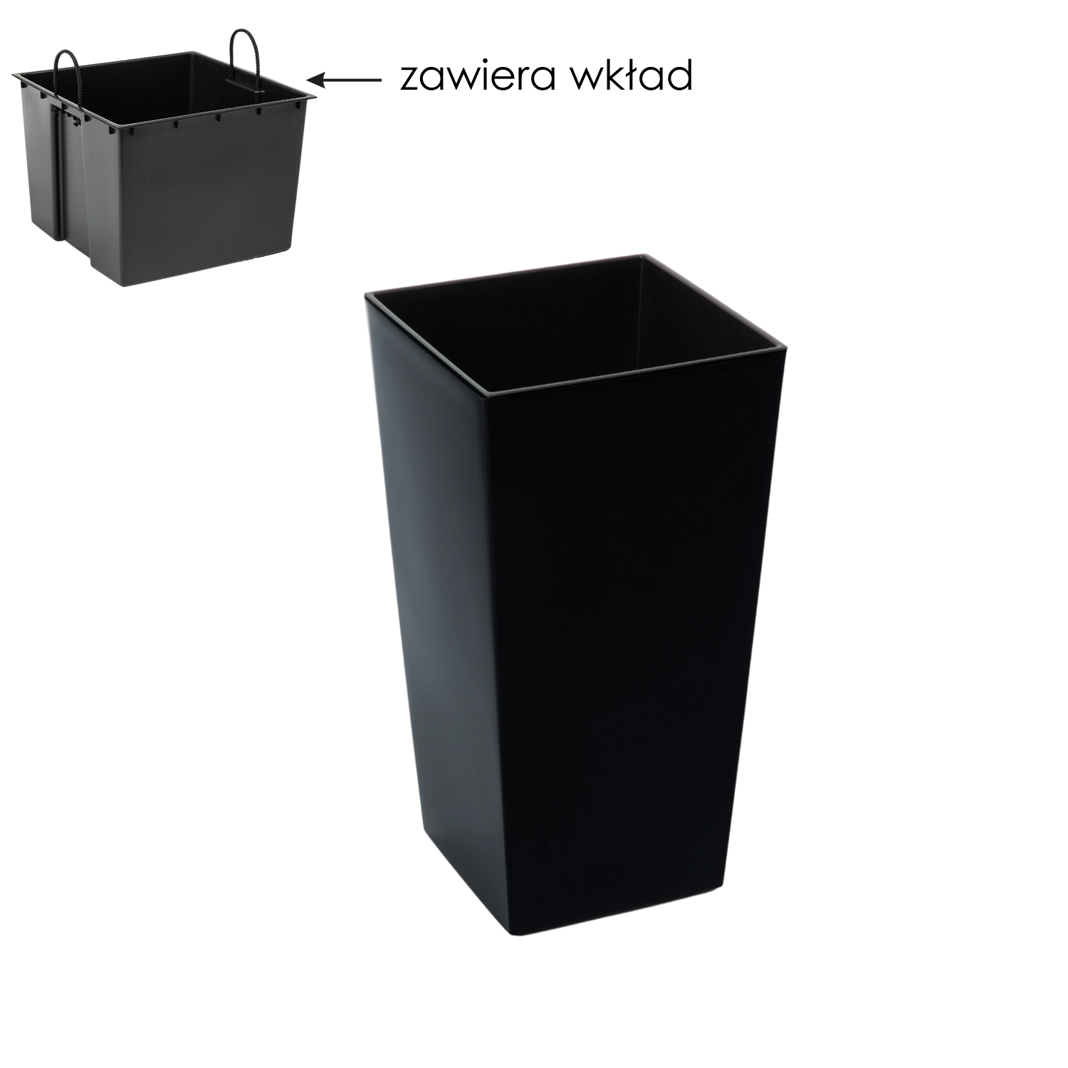 Elegáns fekete Finezja kaspó 19 × 19 × 36 cm méretben, amely a modern megjelenést praktikus funkciókkal ötvözi. Kiváló minőségű műanyagból készült, fagy- és UV-álló, így hosszú távon megőrzi színét és formáját. A része egy kivehető betét az egyszerű ültetéshez és intelligens vízszabályozással, amely a gyökereket optimális nedvességen tartja. Ideális használatra beltérben és kültérben, fényes, sima felülettel, amely a kerámiát idézi, és alacsony tömeggel a könnyű kezelhetőségért.