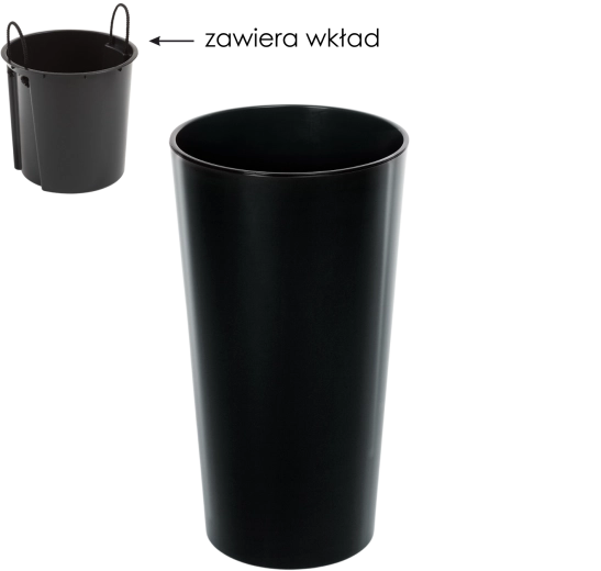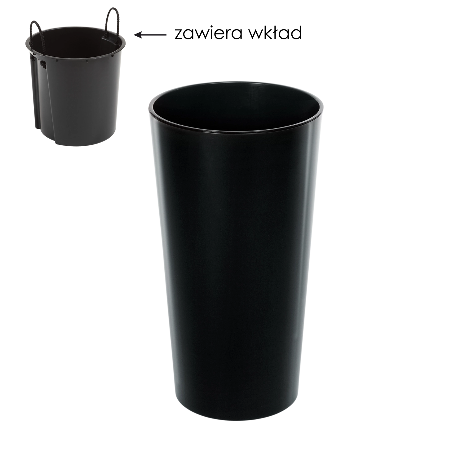 A Lilia, 25 cm átmérőjű, fekete virágtartó a modern dizájnt, a fényes felületet és a tartós polipropilént ötvözi. A kivehető betétnek köszönhetően spórol a földdel, megkönnyíti az átültetést és csökkenti a súlyt, ami beltérben és kültéren egyaránt előnyös.