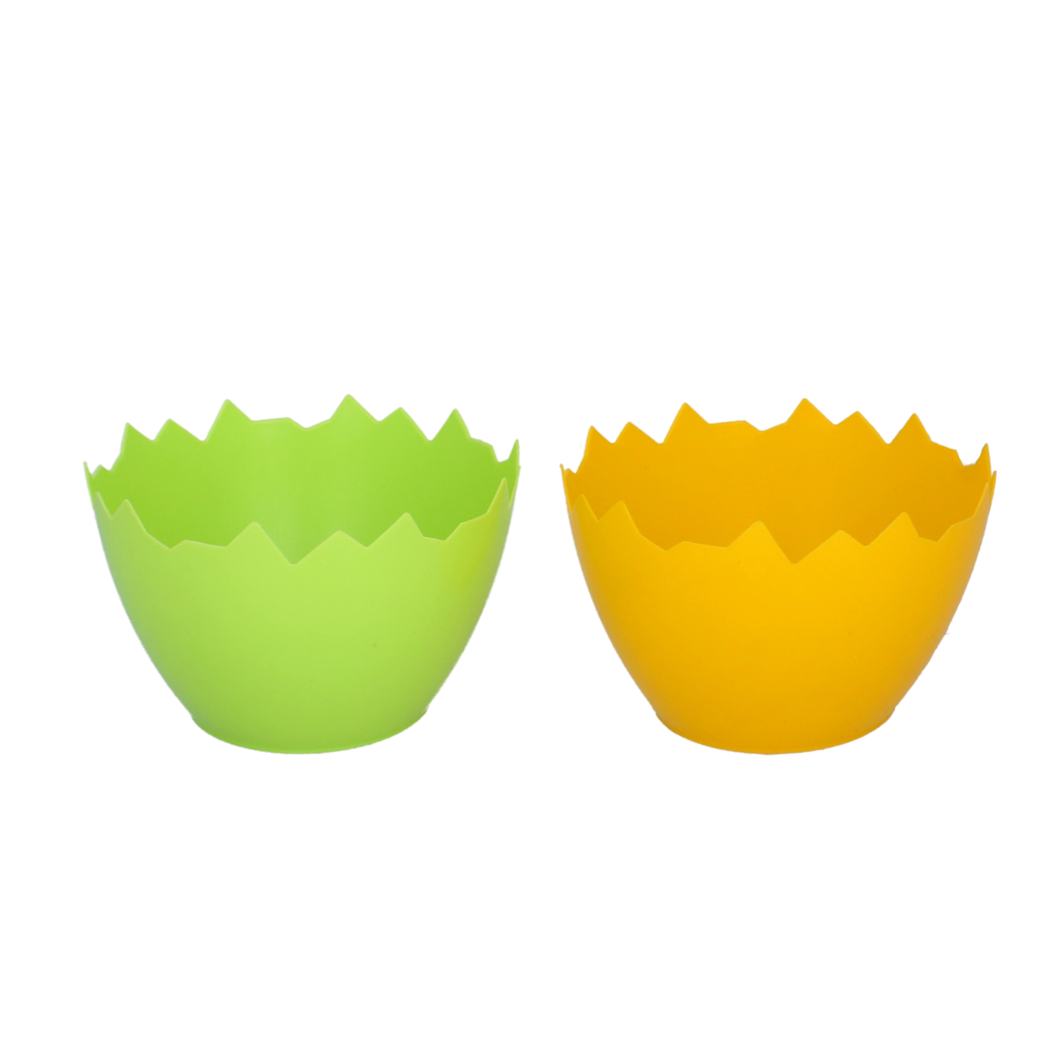 Stílusos dekoráció tavaszra és húsvétra: 15 cm átmérőjű műanyag virágtartó repedt tojáshéj formában, amely friss tavaszi hangulatot visz az enteriőrbe. A pasztell színeknek, a könnyű és tartós műanyagnak, valamint a könnyű karbantartásnak köszönhetően ideális virágkompozíciókhoz, zsázsa neveléséhez és a húsvéti díszítés központi elemeként is.
