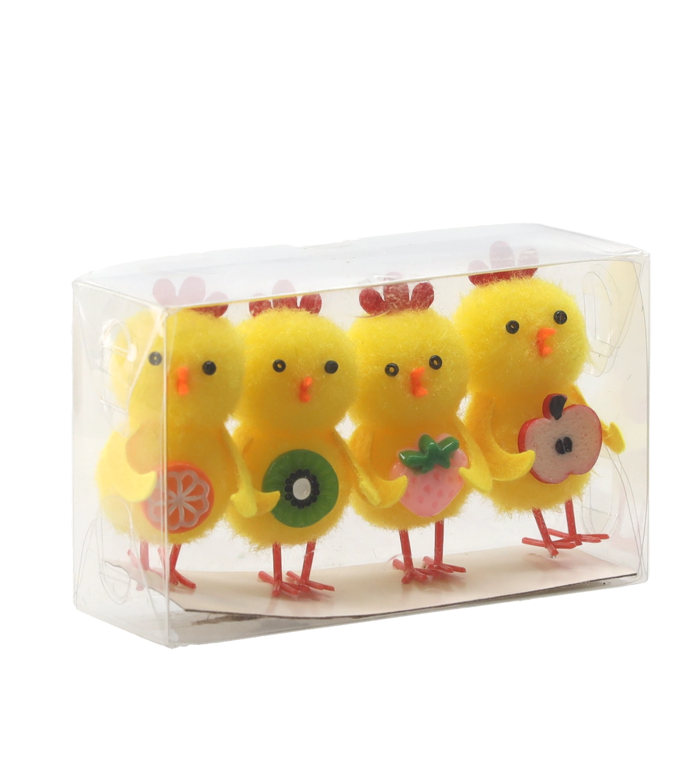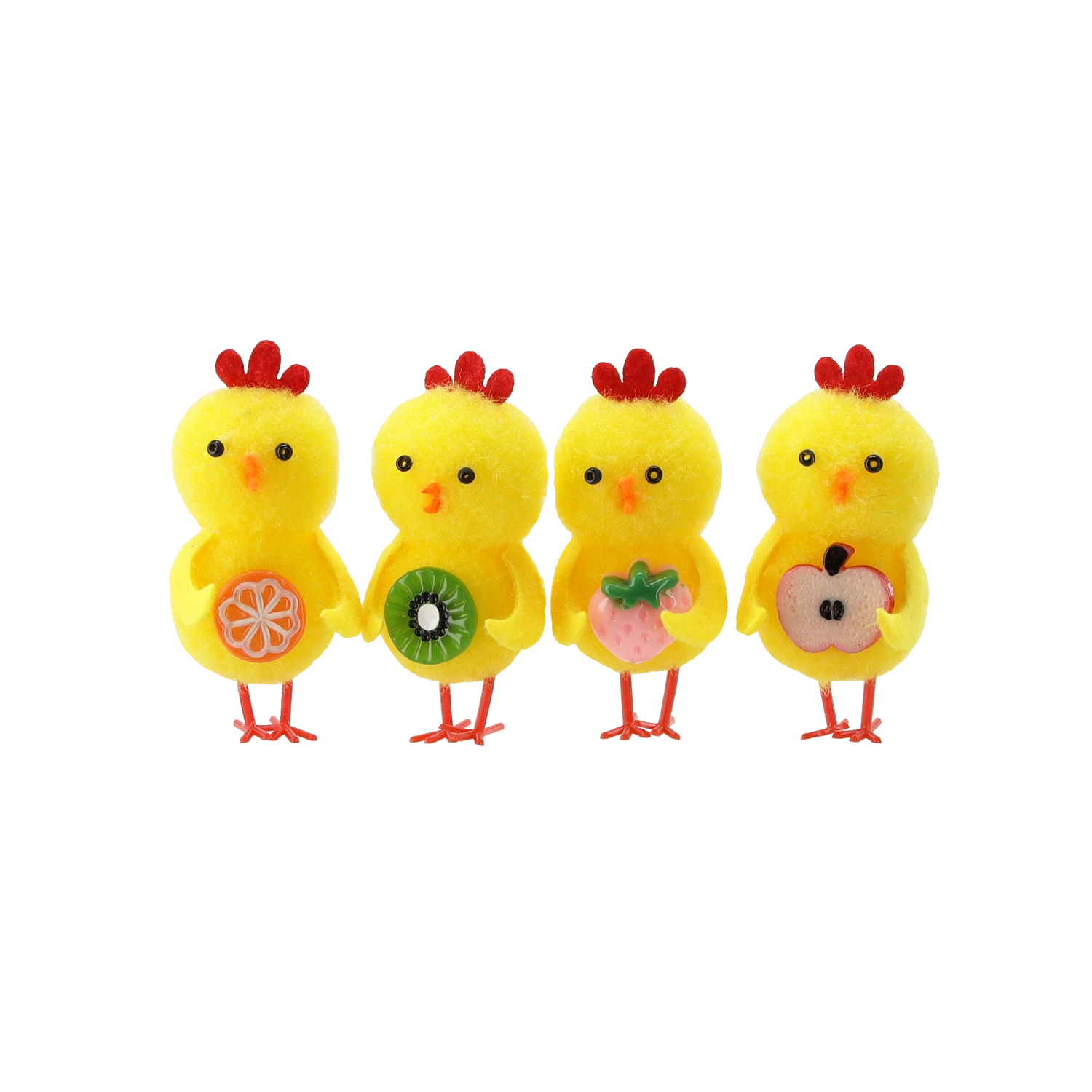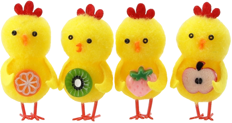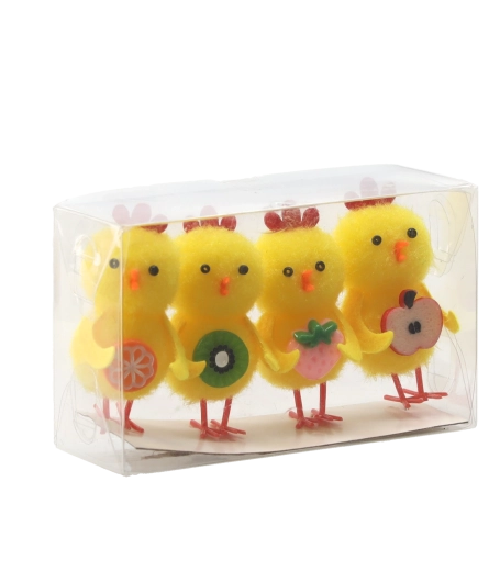 Ez a stílusos, 4 darabos dekoráció minden tavaszi motívumot kedvelőt megörvendeztet. Minden csibe egy-egy gyümölcsöt tart, amely a bőséget és az új kezdetet szimbolizálja, és remekül mutat a húsvéti asztalon, a párkányon vagy tavaszi kompozíciókban. A színkeveréknek köszönhetően könnyedén összehangolható más díszekkel.