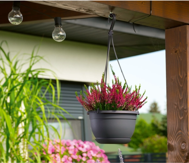 Az elegáns Malta 19 cm átmérőjű, antracit színű függő virágtartó stílusos megoldás erkélyre, teraszra és beltérbe is. Modern dizájnt, praktikus akasztókat a felfüggesztéshez és kivehető tálcát kínál az egyszerű karbantartáshoz. Könnyen kezelhető, fagy- és UV-álló, és a vízelvezető nyílásoknak köszönhetően biztosítja a növények egészséges növekedését.