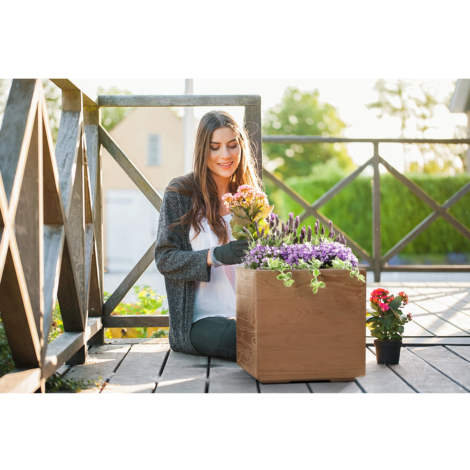 A Karo virágtartó természetes fa dekorral otthonos, természetes hangulatot visz a lakásba, a teraszra és az erkélyre is, a valódi fa gondozása nélkül. A faforgács-adalékos, újrahasznosított műanyagból készült masszív szerkezetnek köszönhetően ellenáll a fagynak és az esőnek, így egész évben stabil hátteret biztosít a növényeknek.