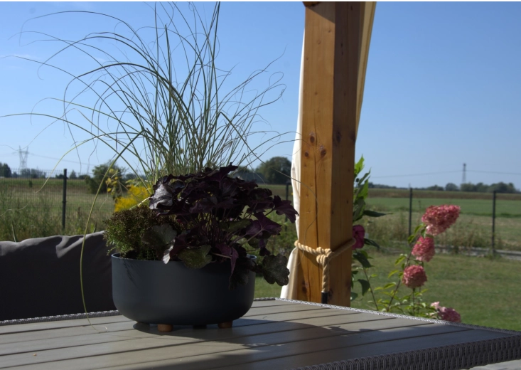 A Sofia 30 cm-es növénytál kiváló választás nagyobb növényekhez és látványos virágkompozíciókhoz. Az újrahasznosított anyagnak köszönhetően környezetkímélő, anélkül hogy a szilárdságból vagy a hosszú élettartamból engedne. A matt fekete felület és a fa lábak időtálló stílust kölcsönöznek, amely modern és klasszikus enteriőrökhöz is illik.