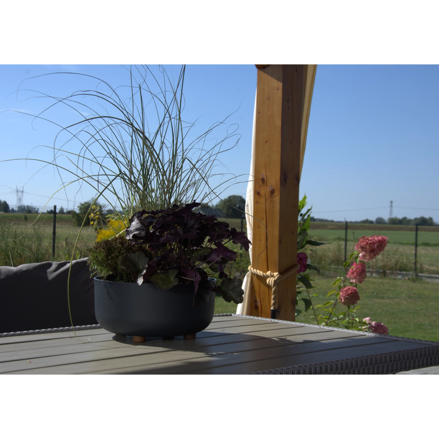 A LAMELA Sofia, 30 cm átmérőjű növénytál a modern dizájnt ötvözi a fenntarthatósággal. Újrahasznosított műanyagból készül, matt fekete felülettel, minimalista megjelenéssel és stabil fa lábakkal. Könnyű, mégis tartós, beltéri és kültéri használatra egyaránt alkalmas, fagy- és UV-álló.