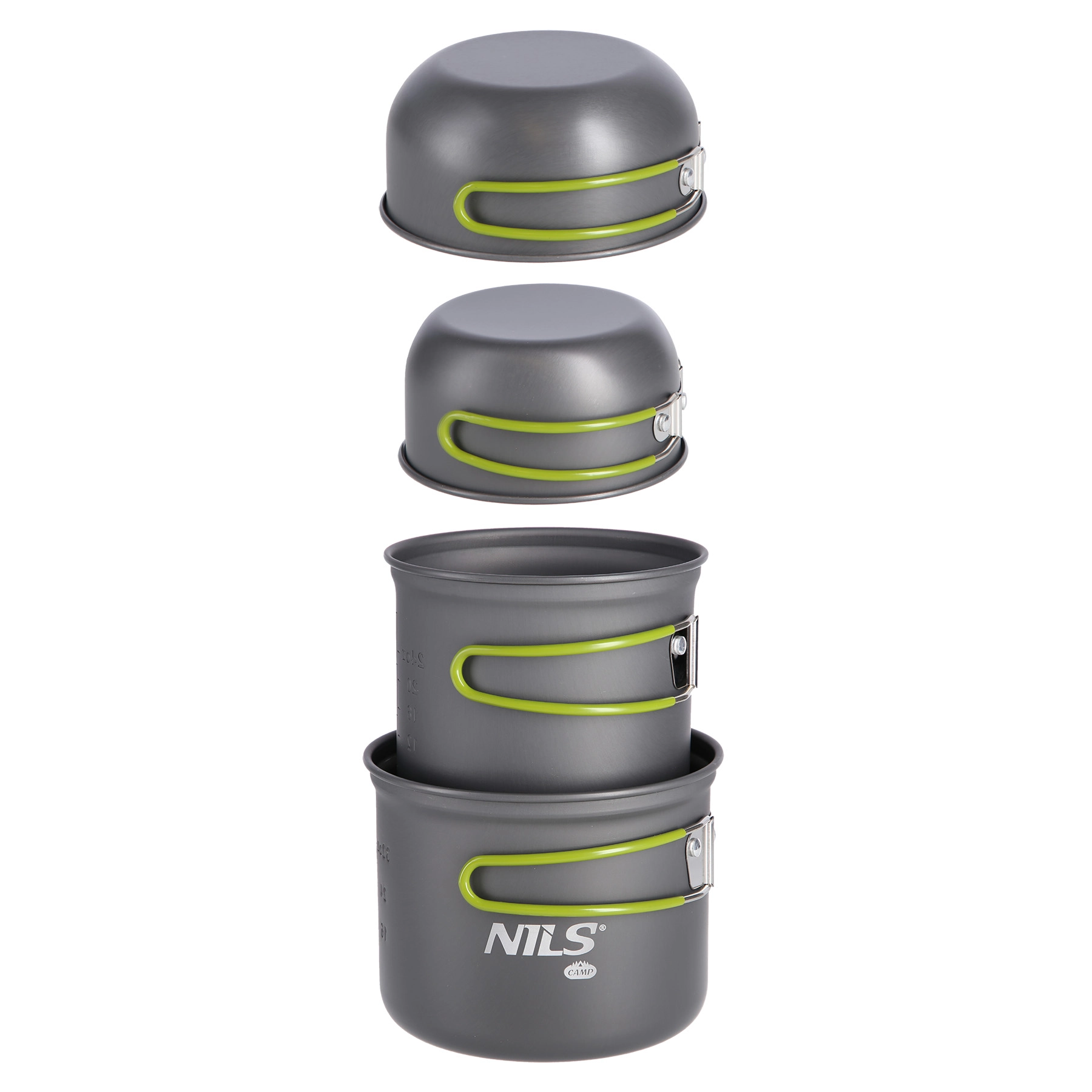 A nagyobb és a kisebb fazekat két tál egészíti ki, amelyek egyben alacsony falú serpenyőként is használhatók sütéshez. Az alacsony tömegnek és a mellékelt zsáknak köszönhetően a teljes készlet könnyen hordozható, és pillanatok alatt bevetésre kész.