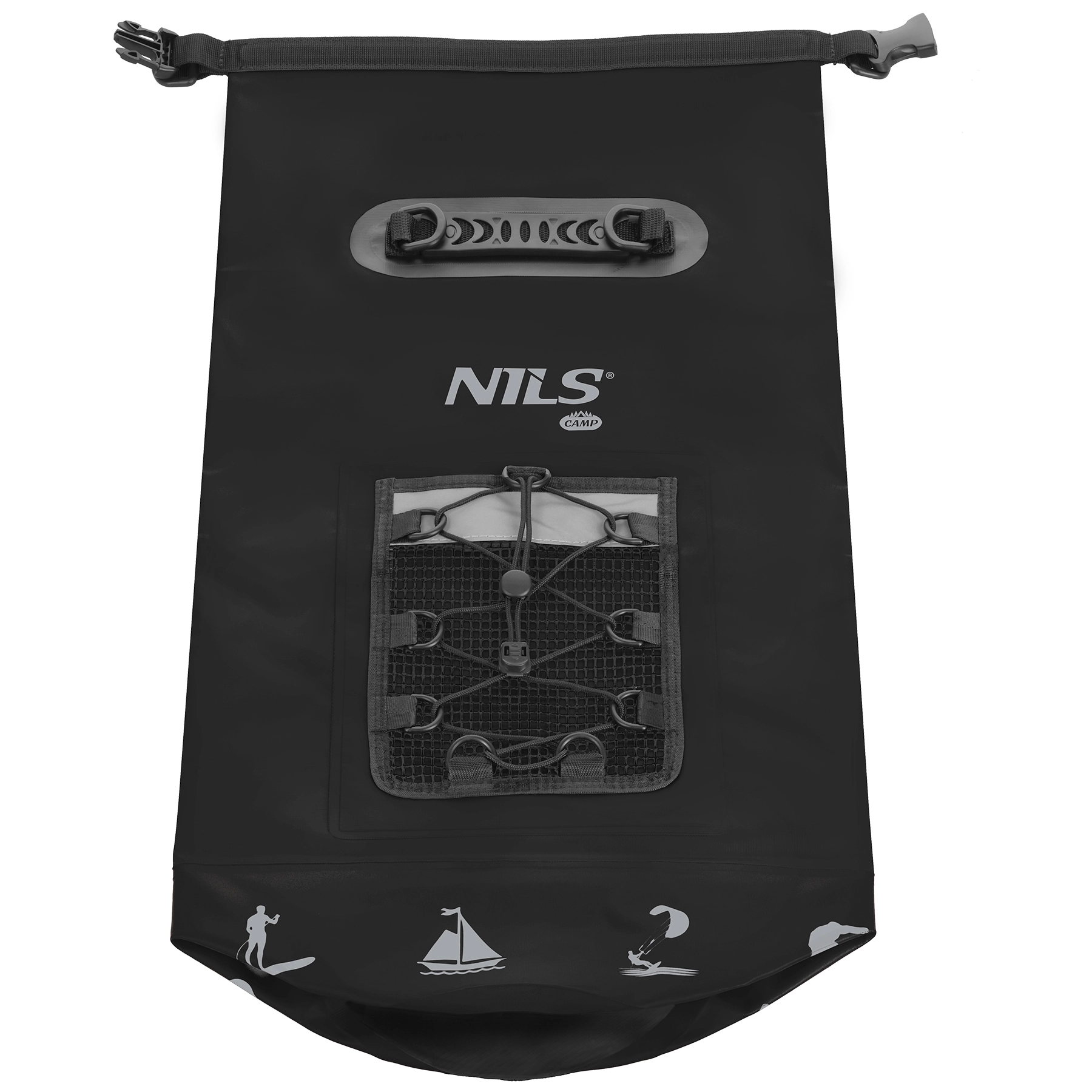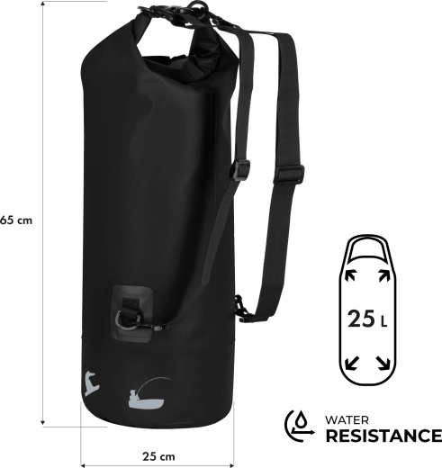 A zsák levehető és állítható vállpántokat kínál a kényelmes hordáshoz hátizsákként, vagy kézben a formázott fogantyúval. Az előlapon hálós zseb bungee zsinórral található palacknak vagy apróságoknak, amelyeket azonnal el szeretne érni. A kompakt, hengeres kialakítás megkönnyíti a pakolást kajakba, kenuba és az autó csomagtartójába is.