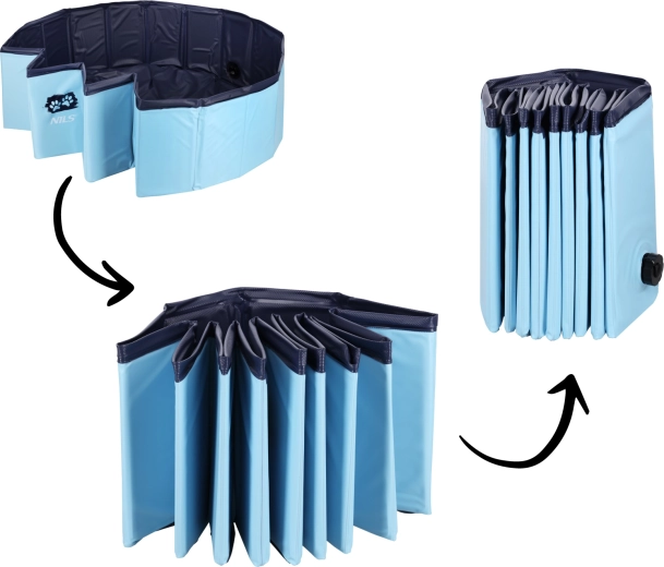 A NILS összecsukható kutyamedence remek választás forró napokra a kertben, teraszon vagy erkélyen. A masszív PVC-nek és a belső MDF merevítéseknek köszönhetően formáját és stabilitását akkor is megőrzi, ha a vízi játékok kicsit vadabbra sikerülnek. A felfújást nem igénylő kialakítás gyors használatot biztosít – egyszerűen kinyitod, megtöltöd, és már kezdődhet is a móka.