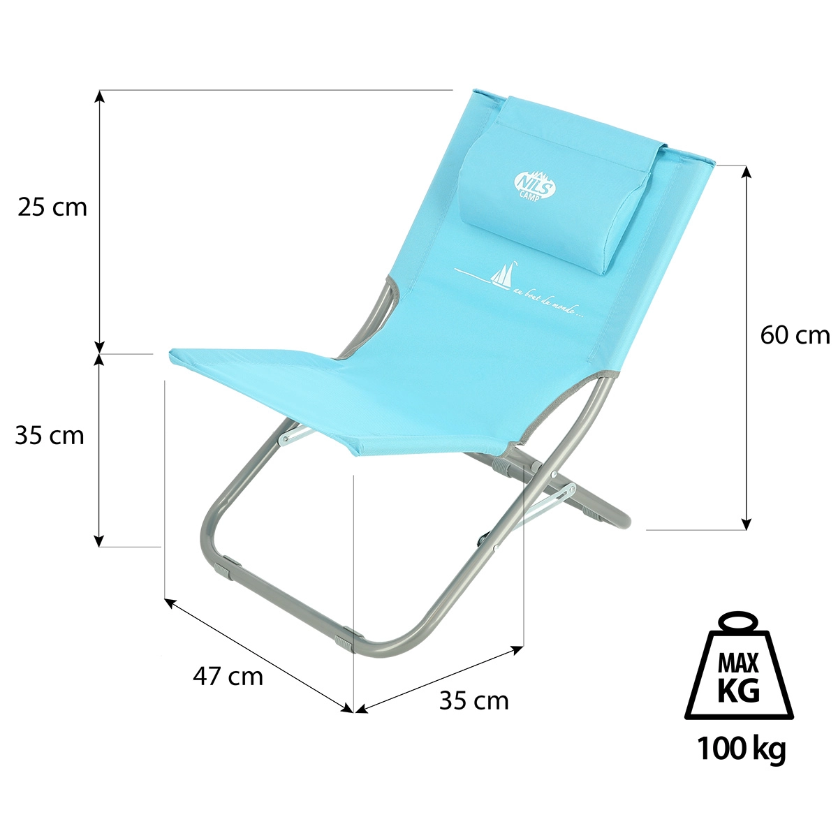 A NILS Camp NC3136 strandszéket a kényelem és a hosszú élettartam jegyében tervezték. A 22 mm átmérőjű acélcsövekből készült masszív váz minőségi szegecsekkel kapcsolódik, és tartós Oxford 600D szövettel van bevonva, amely jobban ellenáll a kopásnak és az időjárás viszontagságainak. Az alacsony profilú kialakítás stabil alappal biztos üléshelyzetet nyújt homokon, füvön és kemény felületen is.
