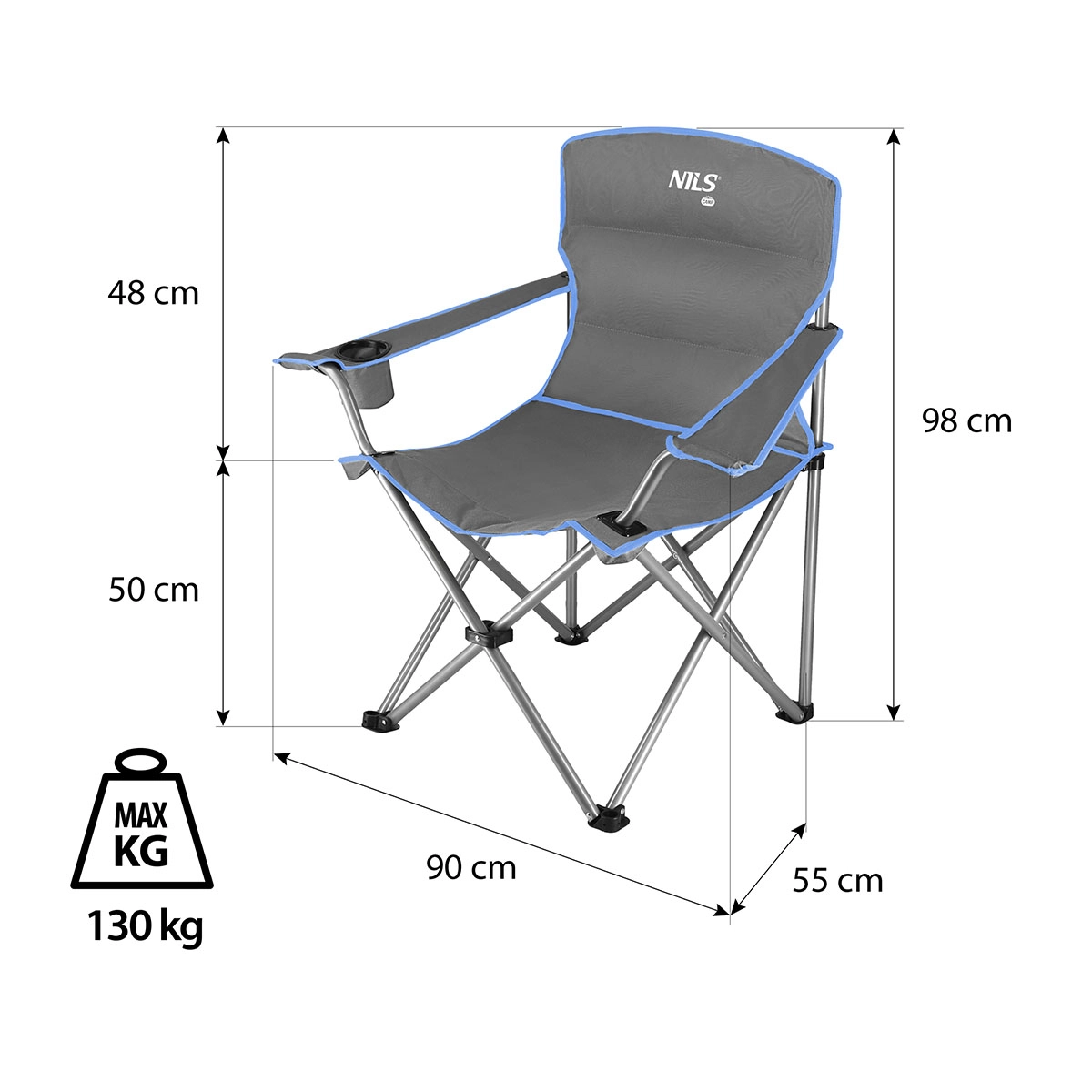 Az ergonomikus, magasságában állítható kartámaszok és a beépített pohártartó maximális kényelmet biztosítanak ülés közben. A széles műanyag lábvégek javítják a stabilitást és megakadályozzák a süllyedést puha talajon. Használat után a széket könnyedén összecsukhatja a kompakt, vállpántos hordtáskába.