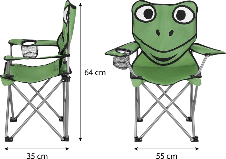 A Nils Camp könnyű és tartós, békamintás gyermek összecsukható széke ideális vízpartra, horgászathoz, fesztiválokra és sátrazáshoz. Kínál erős acél vázszerkezetet, strapabíró 600D poliészter huzatot, 50 kg teherbírást és praktikus pohártartót. Könnyen összehajtható, és a vállpántos hordtáskának köszönhetően a gyerek bárhová magával viheti.