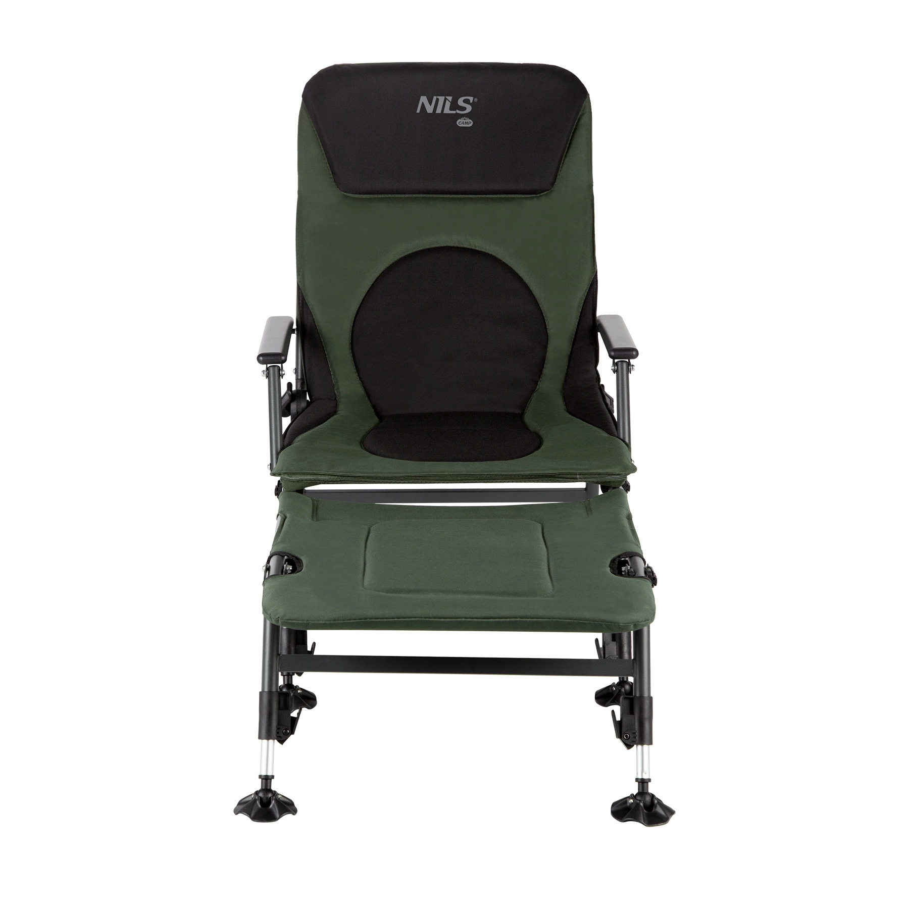 A NILS CAMP NC1802 modell ötvözi a nyugágy kényelmét és az összecsukható szék praktikusságát. A két rétegű, párnázott, tartós 600D Oxford szövet kellemesen megtámasztja a hátat, míg a fokozatmentesen állítható háttámla és a levehető lábtartó lehetővé teszi az ülésből majdnem fekvő pozícióba váltást. Állítható teleszkópos lábak alkalmazkodnak a terephez, a széles talpak pedig növelik a stabilitást.