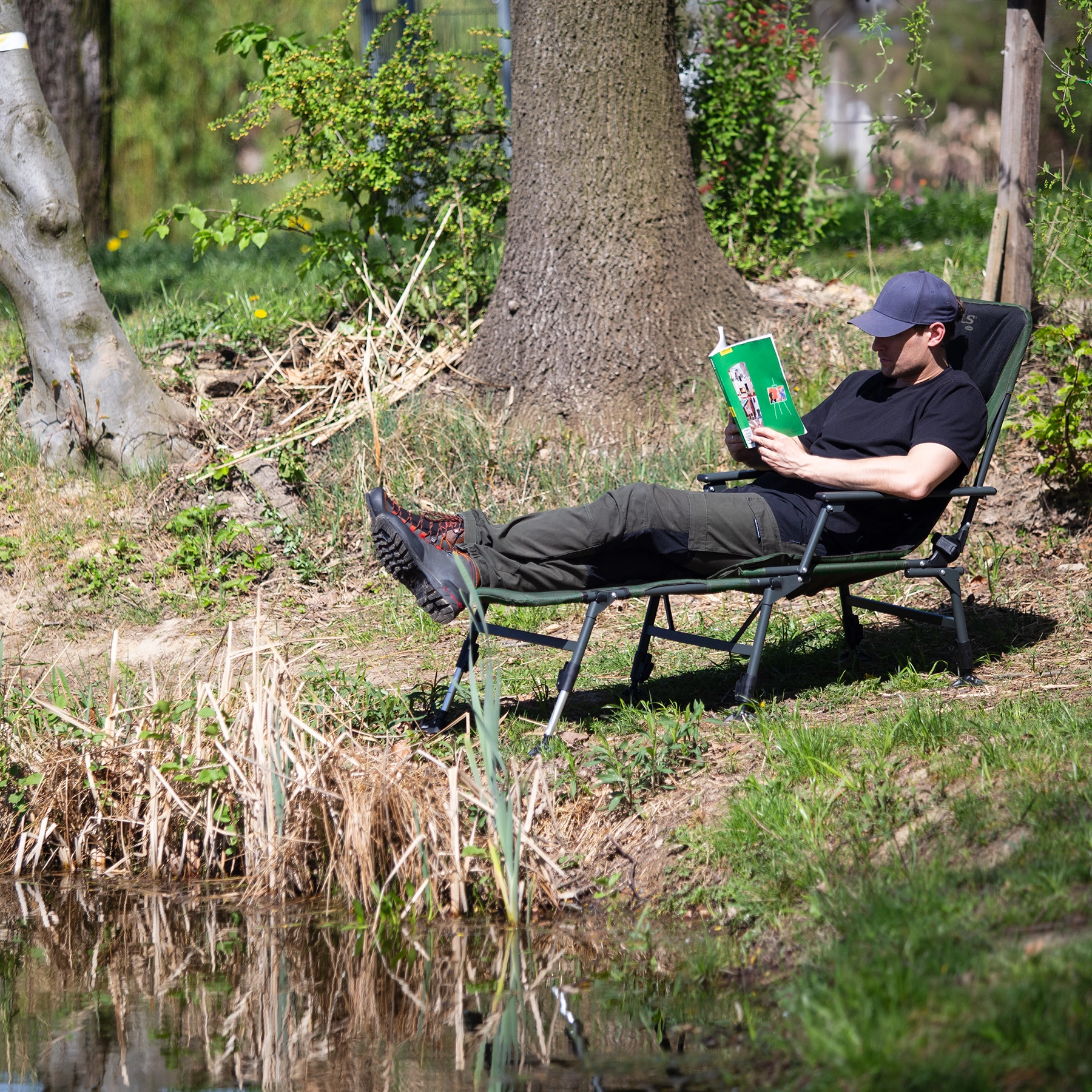 A háttámla fokozatmentes állítása és a levehető lábtartó kényelmes nyugággyá alakítja a széket – ideális a hosszabb vízparti várakozáshoz vagy túra utáni pihenéshez.