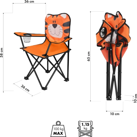 Praktikus és vidám ülőhelyet keres kis felfedezőknek? A NILS Fun gyerek összecsukható szék aranyos tigris mintával stabil tartást, gyors felállítást és kompakt méretet kínál összecsukva. Tökéletes családi kempingezéshez, a strandra vagy parkbeli piknikhez.