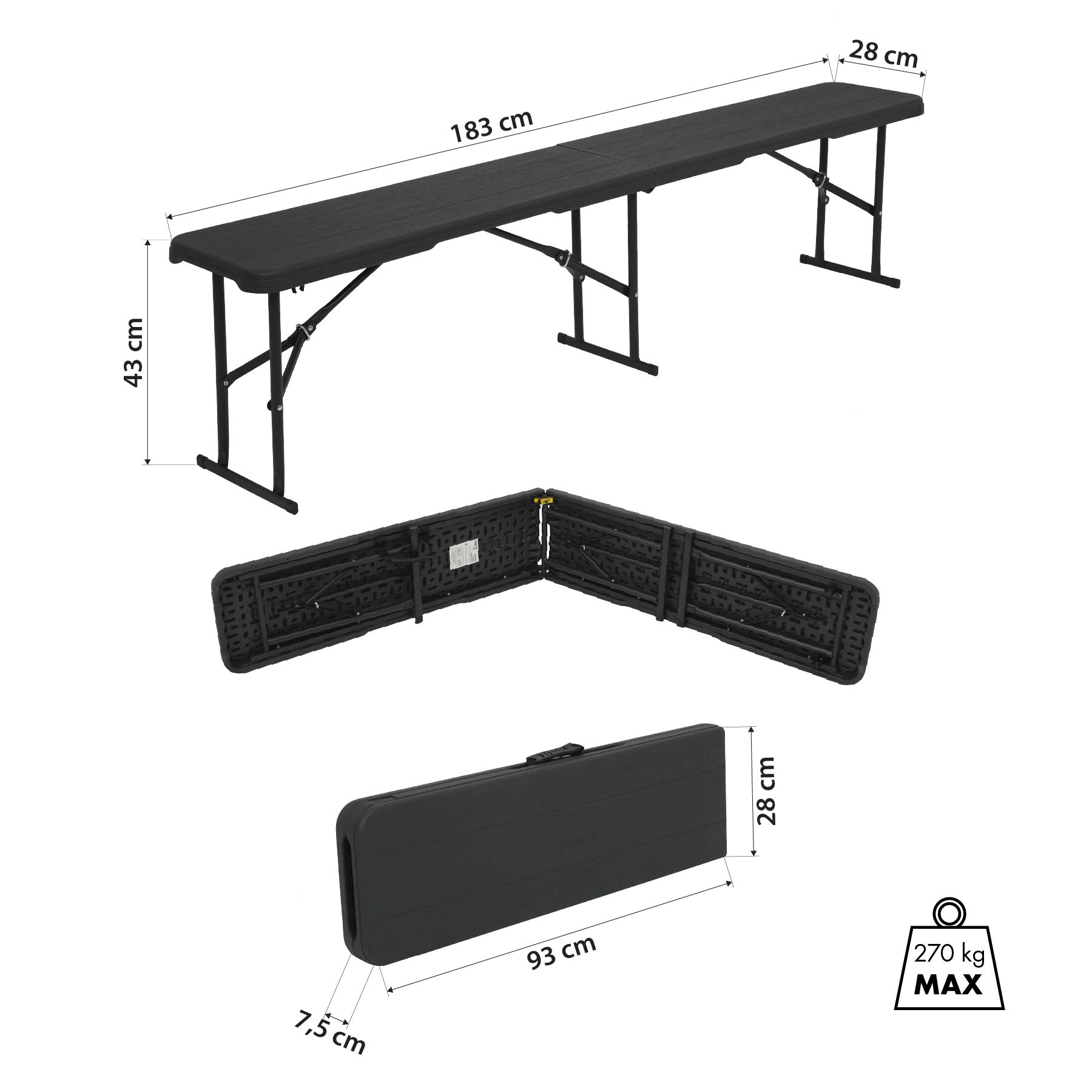 Praktikus és strapabíró, összecsukható pad kertbe, kempingezéshez és rendezvényekre. Kínál 183 cm hosszú ülőfelületet, akár 270 kg teherbírást, könnyű összecsukhatóságot és alacsony, 6,5 kg-os tömeget. A HDPE és porszórt acél szerkezet stabilitást, egyszerű tisztítást és hosszú élettartamot biztosít.