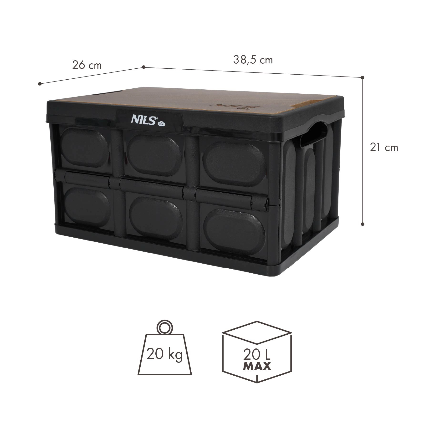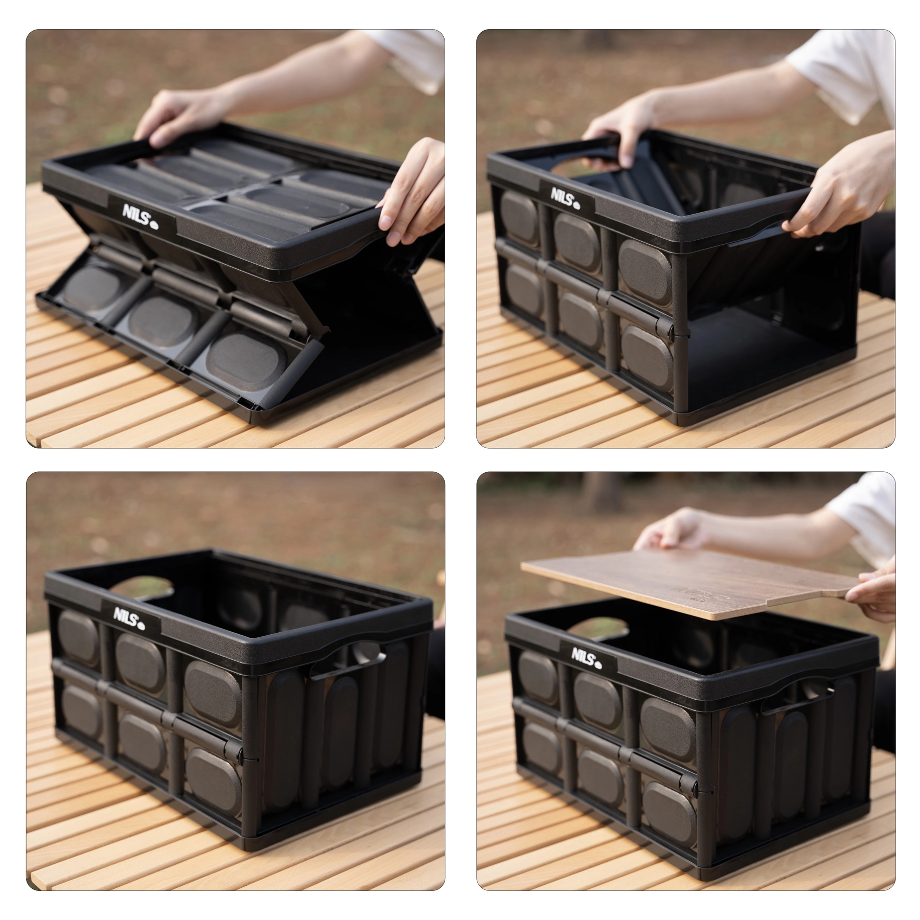 Praktikus, 20 l-es NILS Camp összecsukható láda strapabíró fa tetővel, amely egyszerre szolgál tárolódobozként és stabil asztalként. Könnyű, 5 cm-re összehajtható, egymásra rakható, és tartós polipropilénből készült, ezért ideális autóba, otthonra, kempingezéshez és műhelybe is.