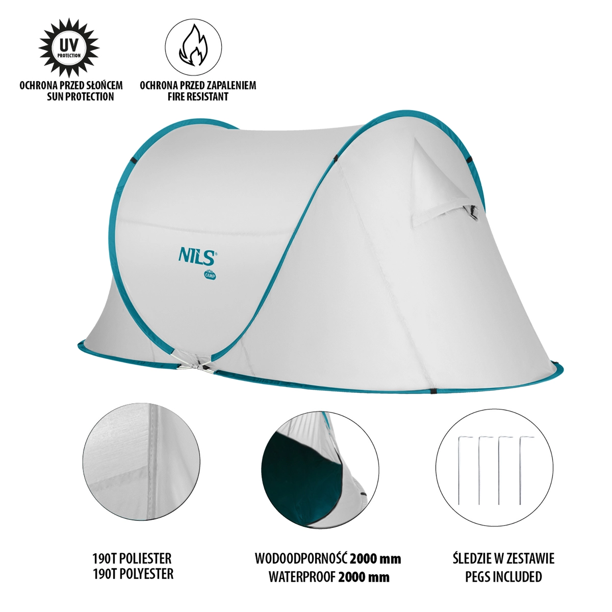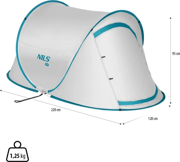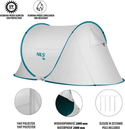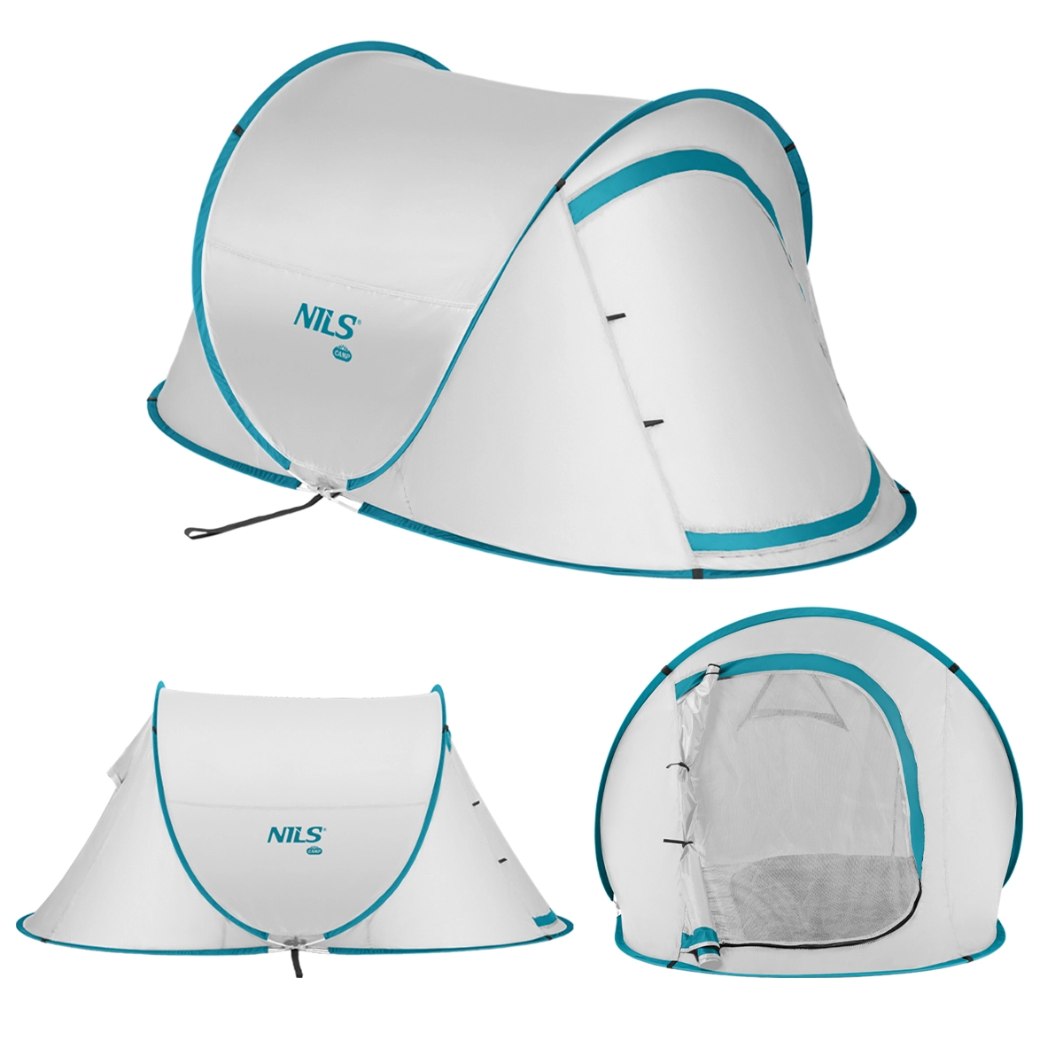 A NILS Camp sátor a gyors és kényelmes pihenésre készült tengernél, tónál vagy akár a kertben. A pop-up rendszernek köszönhetően néhány másodperc alatt kinyílik a hordtáskából, szerszám és bonyolult kezelés nélkül. A szúnyogháló és az elülső, cipzáras ponyva véd a rovaroktól és a széltől, míg a szellőzőnyílás friss levegőt és kellemes klímát biztosít belül.