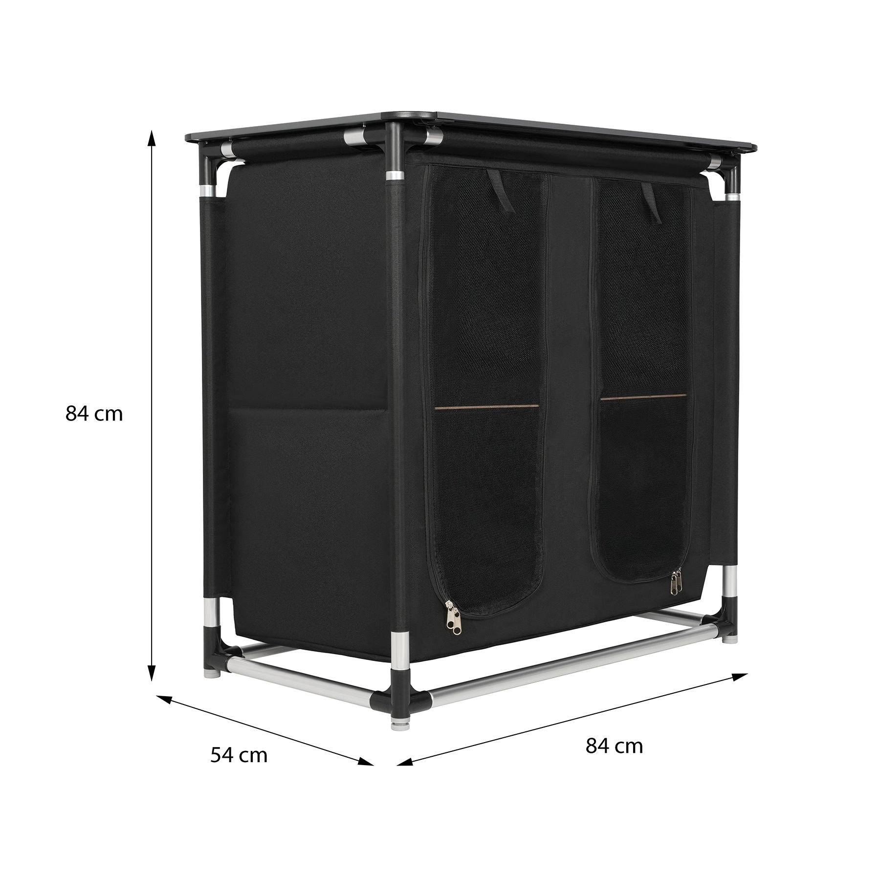 A belső teret 4 elkülönített rekesz alkotja laminált rétegeltlemez polcokkal, ideális élelmiszerek, edények, ruházat vagy túrafelszerelés számára. Az elülső, cipzáras panelek védik a tartalmat a portól, széltől és rovaroktól. A 9 alumínium lamellából álló, 83 × 52 cm méretű felső lap stabil munkafelületként vagy lerakóként szolgál.