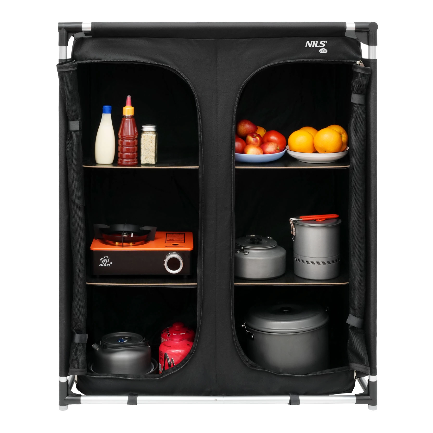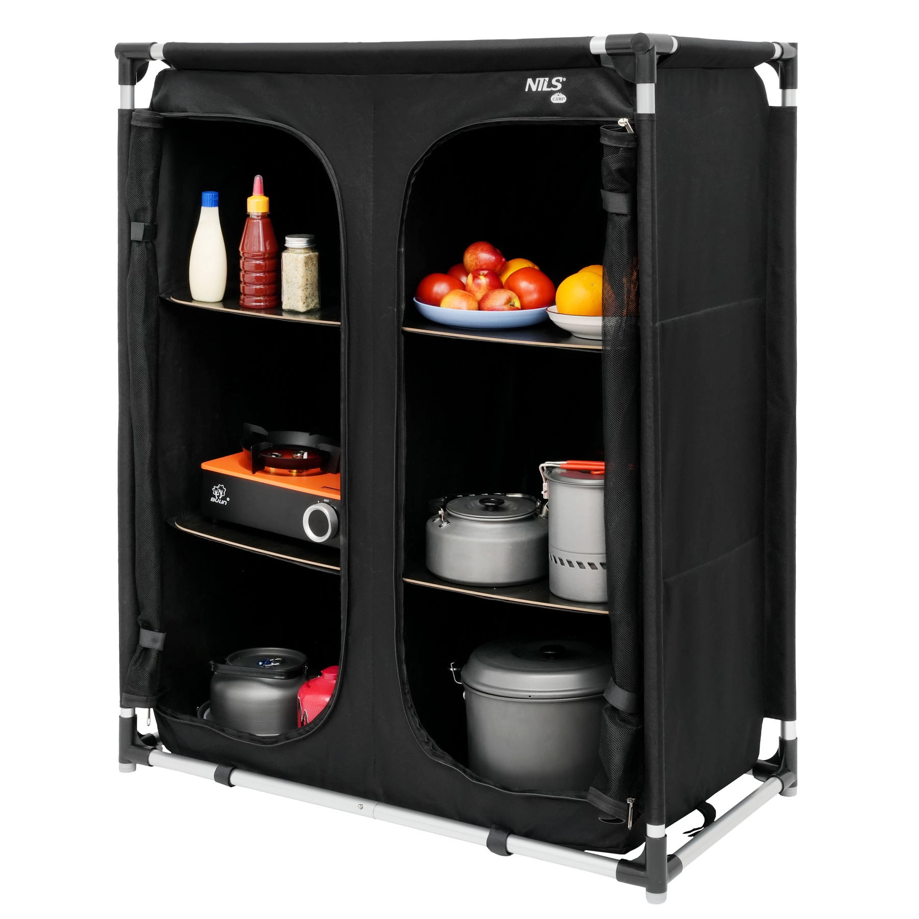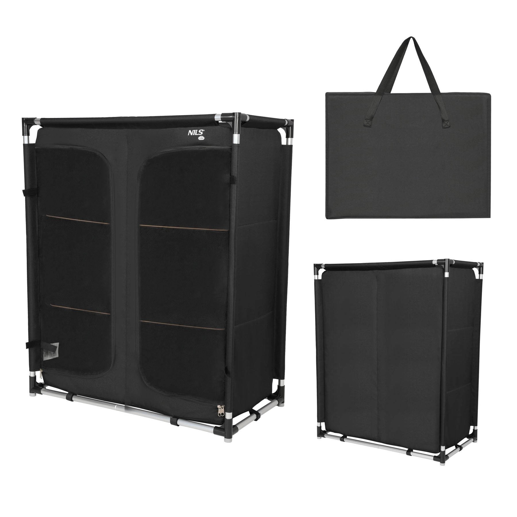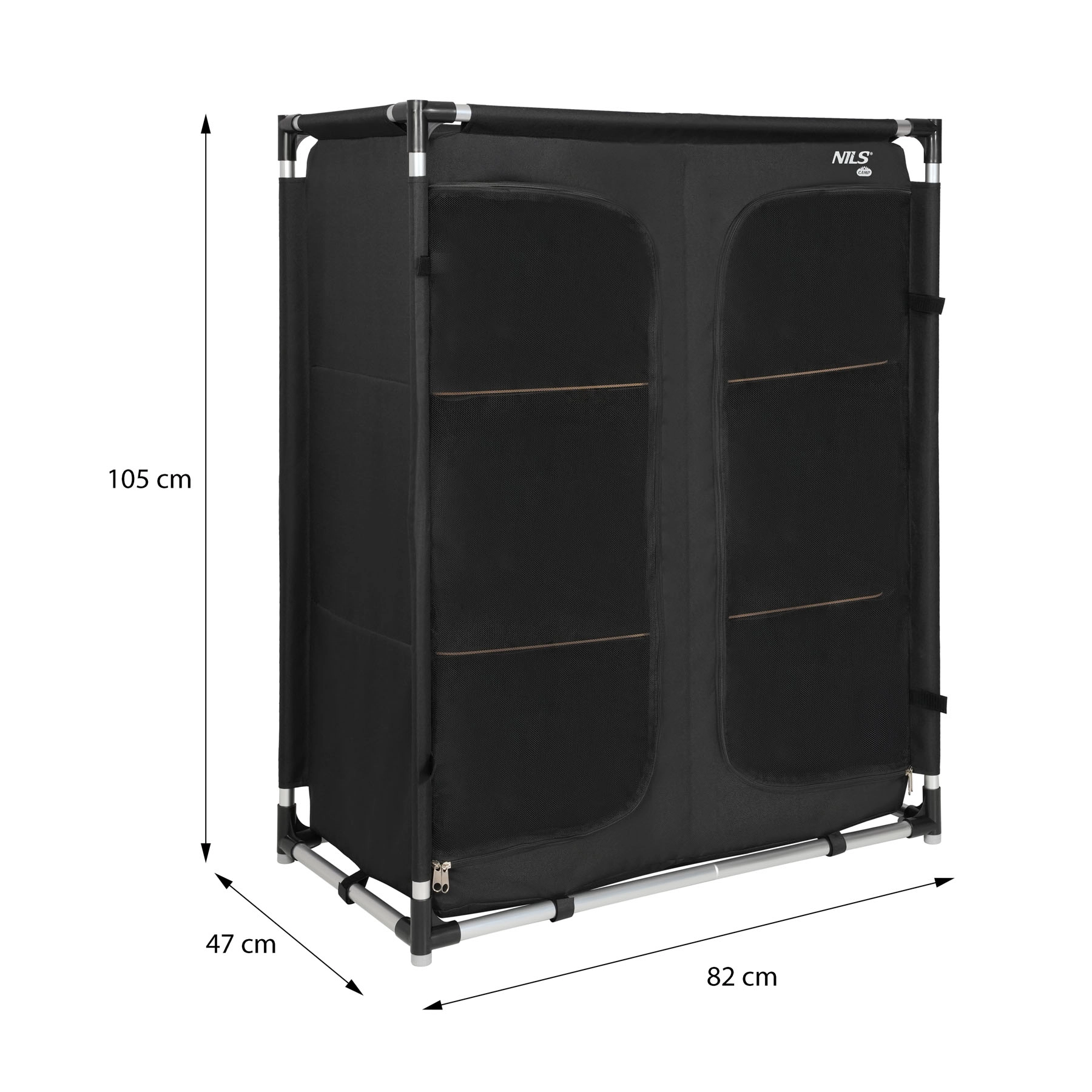 Az alumínium váz könnyű, mégis tartós, így a szekrény egyenetlen felületen is stabil marad. Az összeszerelés és a szétszerelés csak pár percet vesz igénybe. Összecsukás után az előre mellékelt táskába helyezhető – ideális megoldás kempingezéshez, lakókocsihoz, nyaralóhoz vagy hosszabb családi kirándulásokhoz.