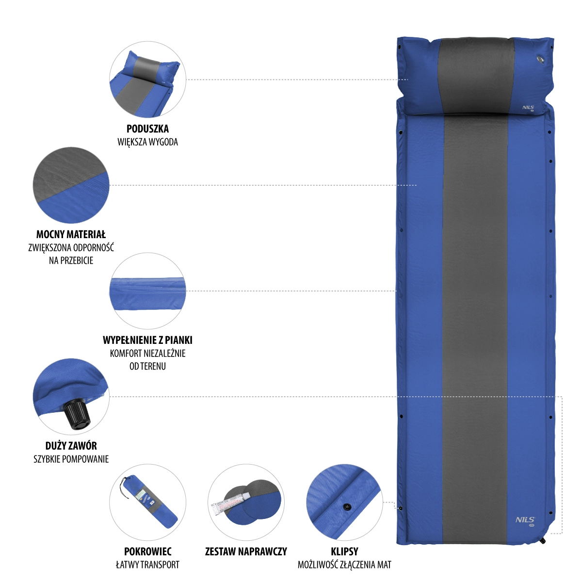 A strapabíró 75D poliészter PVC bevonattal könnyen tisztítható és vízálló, ezért ideális kempingezéshez, sátorhoz és vízpartra is. A praktikus oldalsó patentok révén több derékalj egy felületté kapcsolható – ideális megoldás családoknak vagy a sátópadló teljes lefedéséhez. Használat után a derékalj a szelep nélküli vég felől feltekerve könnyen leereszthető, csatos pántokkal rögzíthető és a szállítózsákba helyezhető.