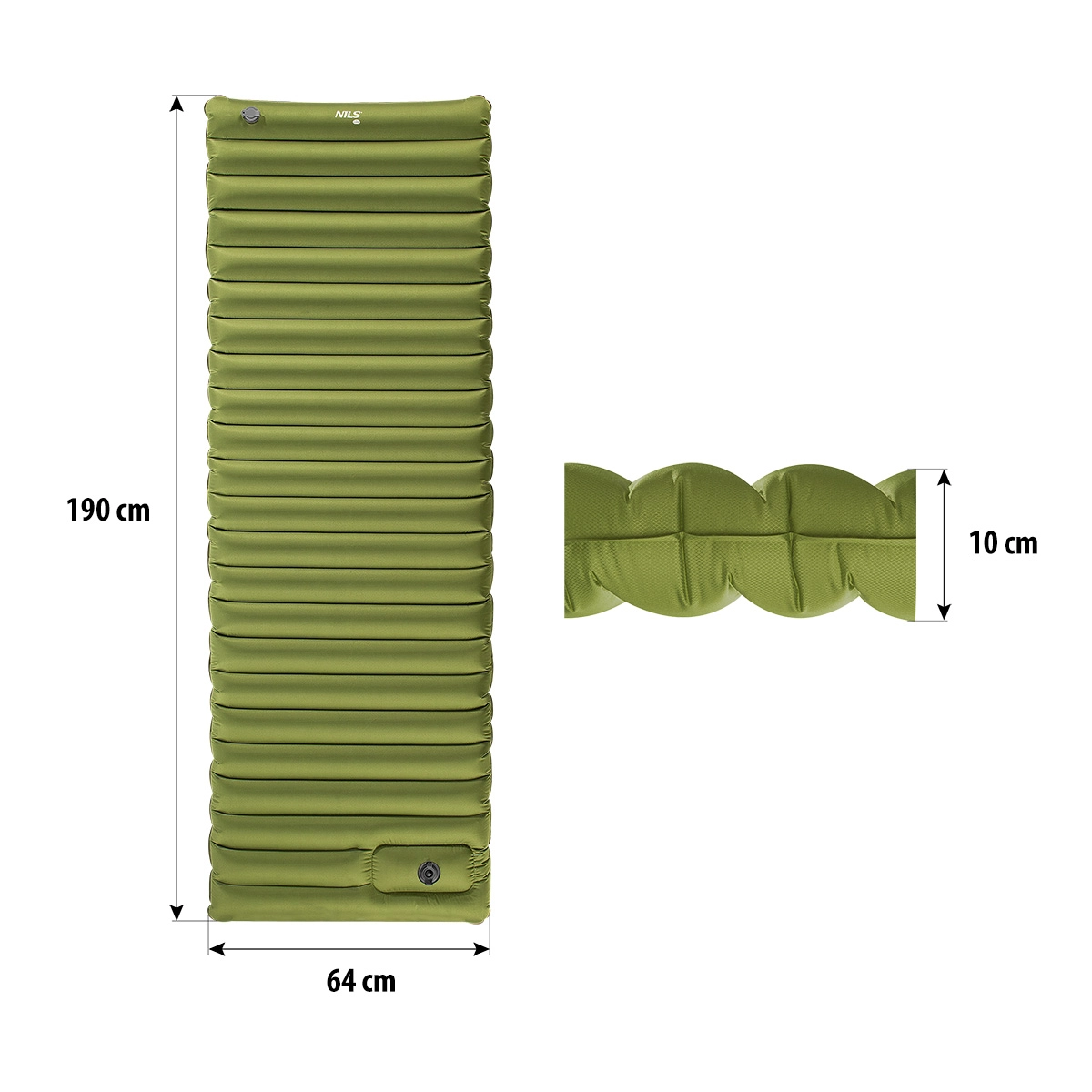Élvezze a nyugodt alvást otthonon kívül is. Ez a zöld NILS Camp derékalj beépített lábpumpával pillanatok alatt felfújható – elég rövid, lendületes mozdulatokkal rálépni a pumpára, és egy percen belül kész. Teljesen felfújva kényelmes, 10 cm-es magasságot ér el, így kiválóan szigetel a talajtól és kiegyenlíti a terep egyenetlenségeit.