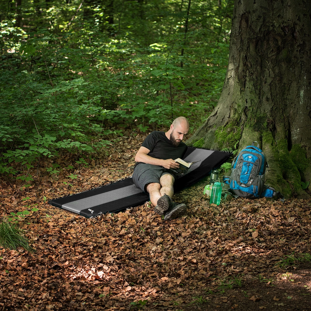 Élvezd a nyugodt alvást a természetben. Ez az önfelfújó derékalj a beépített párnával kényelmet és stabil háttámaszt nyújt a nyitott cellás habnak köszönhetően, amely a szelep meglazítása után magától beszívja a levegőt. A végső keménységhez elég enyhén utánfújni. A tartós PVC felület könnyen tisztítható, és ideális kempingbe, sátor alá vagy a vízpartra.