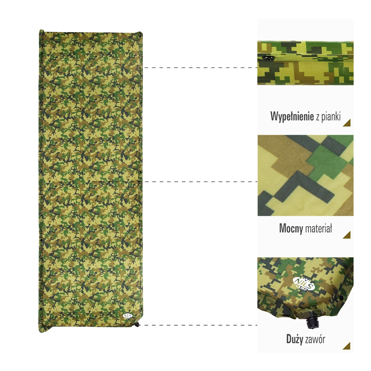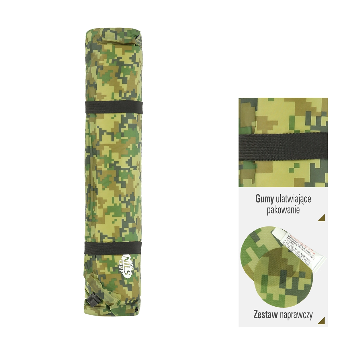 Könnyű és kompakt, önfelfújó NILS Camp hálómatrac terepszínű kivitelben a kényelmes alváshoz kempingezéskor, túrázáskor és fesztiválokon. A önfelfújó rendszernek köszönhetően elég kinyitni a szelepet, és pillanatok alatt használatra kész. Mindössze 1,5 kg-os tömeget kínál, könnyen elcsomagolható a praktikus tokba, méretei pedig ideálisak a komfortos pihenéshez.