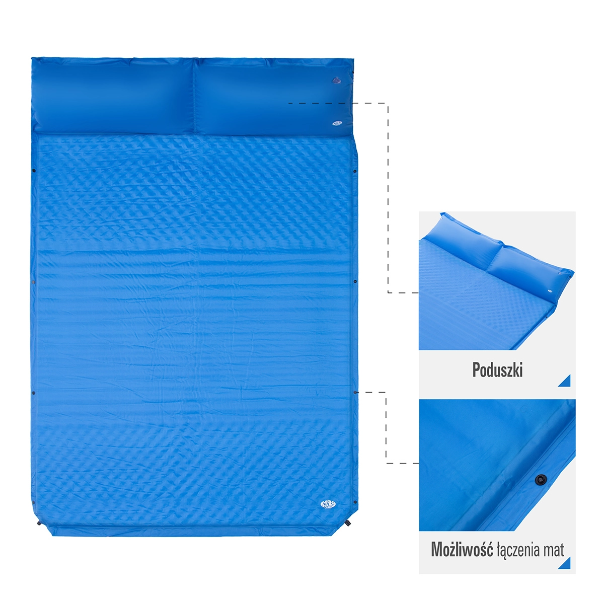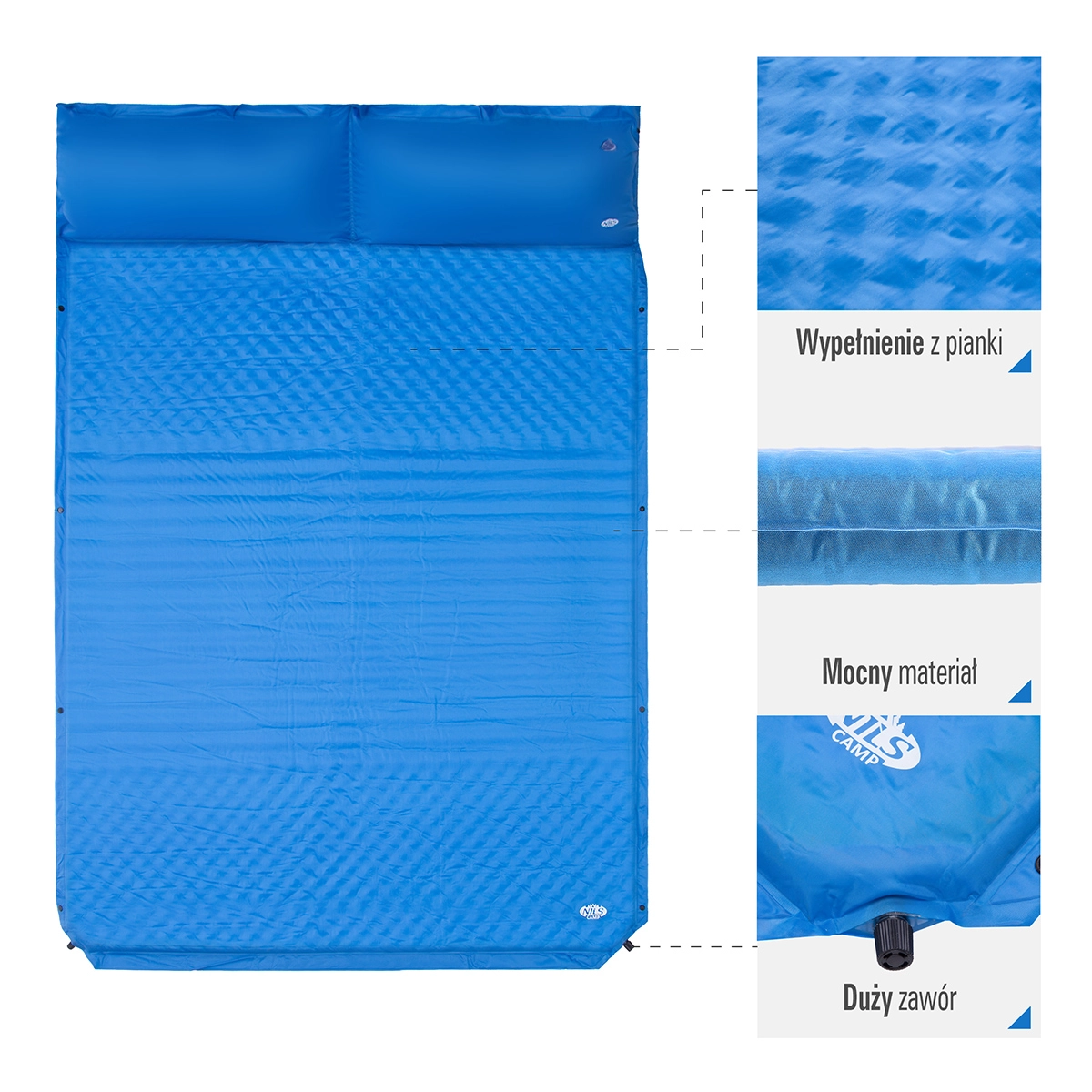 A NILS CAMP NC4060 önfelfújó matracot két személy maximális kényelmére tervezték. A szelep megnyitása után automatikusan levegővel telítődik, így nincs szükség pumpára, és pillanatok alatt stabil, kellemes fekvőfelületet kap. A 130 cm-es szélesség kényelmes teret biztosít pároknak és azoknak az egyéneknek is, akik több helyet kedvelnek.